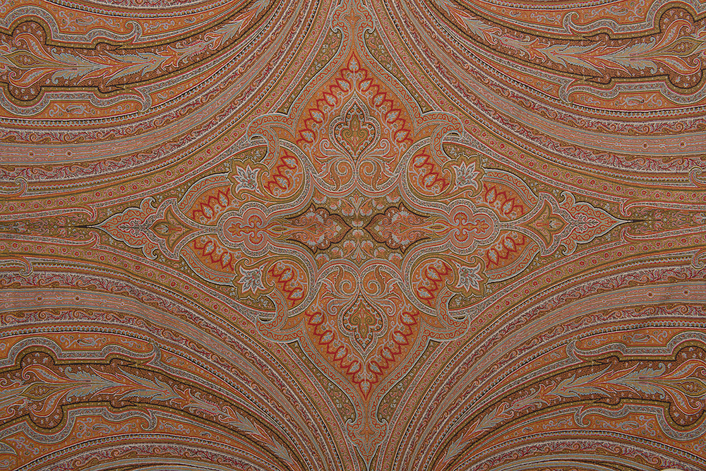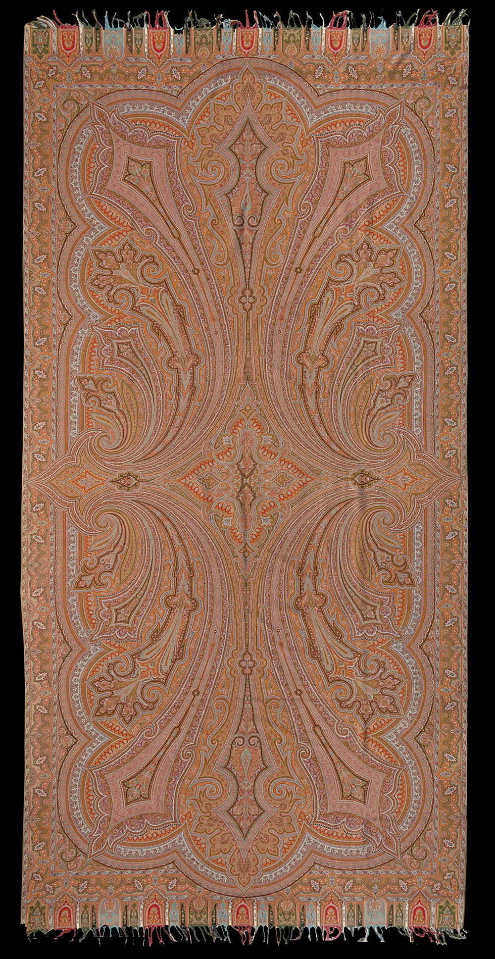 Scialle Kashmir, Francia, seconda metà del secolo XIX. Tessuto a mano in lana con telaio jaquard, disegni a volute senza riserva centrale (cm 340x155) (lievi difetti)