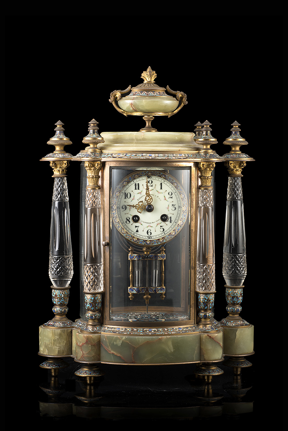 Orologio da appoggio di forma architettonica in onice, smalti cloisonnè e colonne in cristallo, costruito in Francia per il mercato italiano