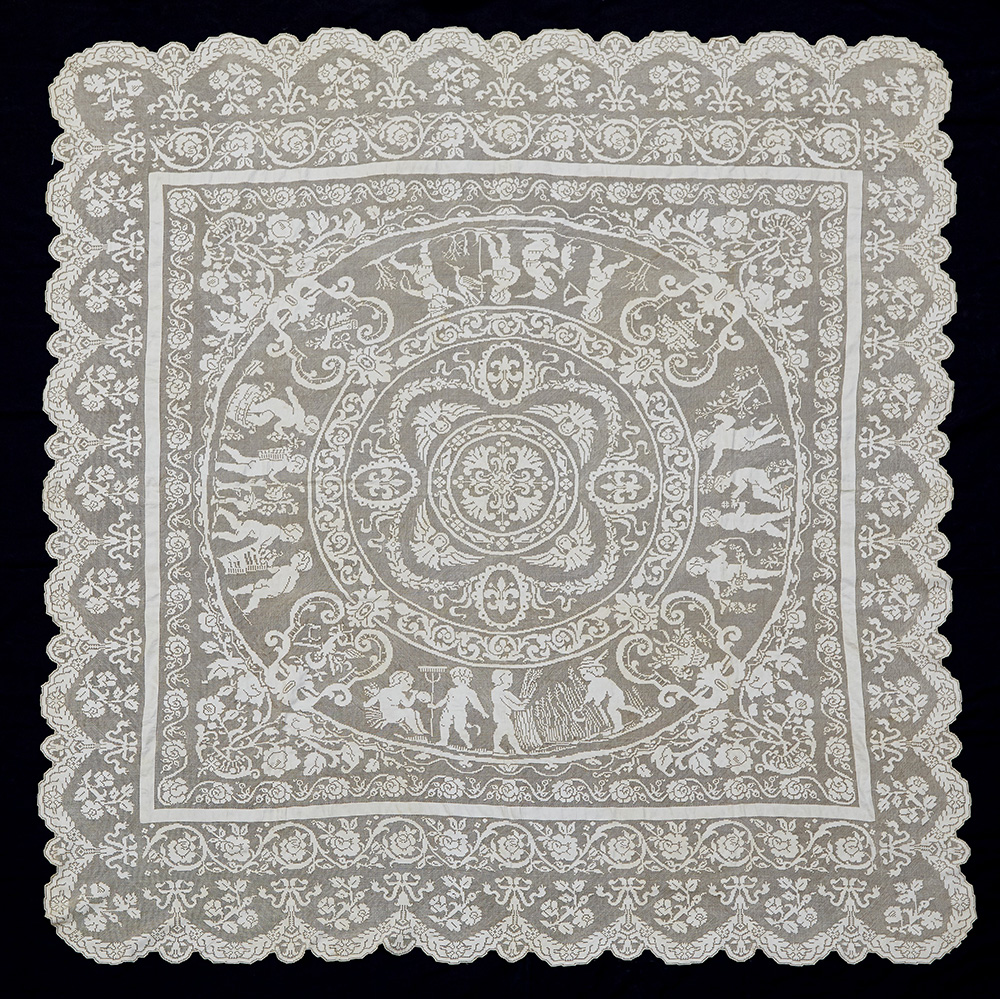 Copriletto in pizzo ricavato da un tessuto di lino sfilato e finito a rete con un cordoncino di cotone sottile perlè. Il decoro è formato dalle rimanenze di tessuto decorato con motivi floreali, gigli di Firenze, angeli, nuvole e putti. Italia secolo XIX (cm 251x236) (lievi difetti)