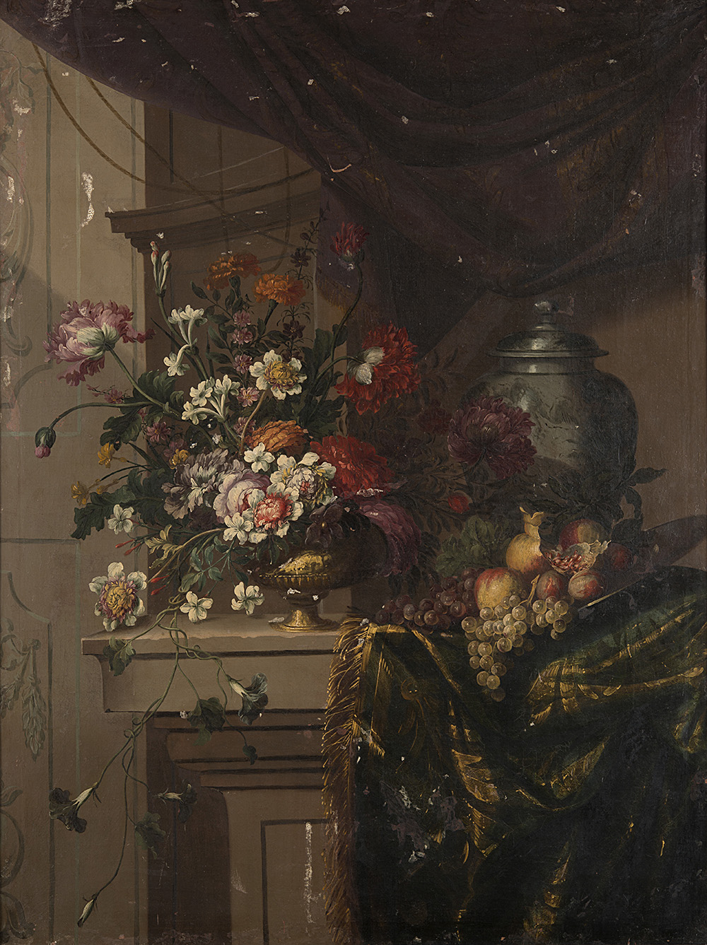 Scuola del secolo XIXNatura morta con fiori e fruttaOlio su tela cm...