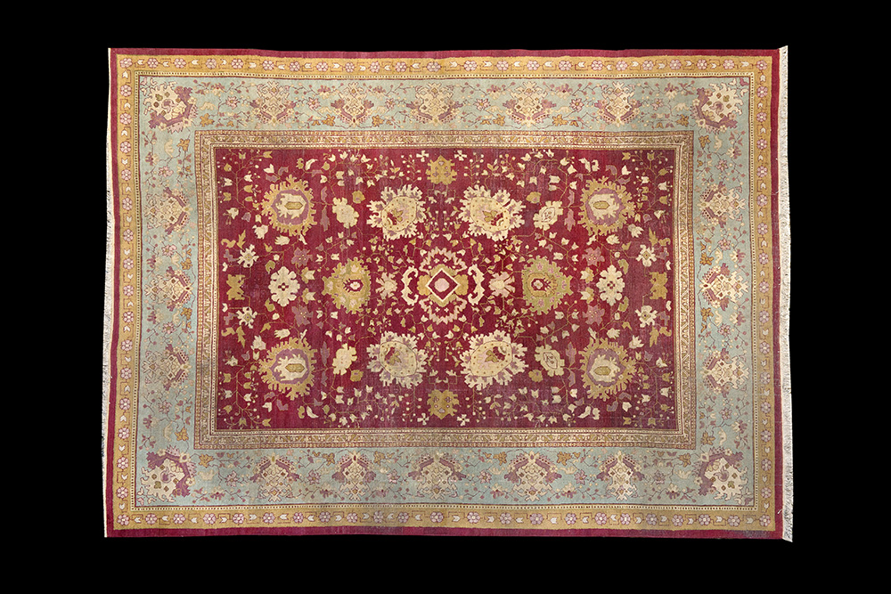 Tappeto Amritzar, India seconda metà secolo XIX. Decoro "all-over" con grandi fiori in file geometriche di ispirazione Mogul su fondo rosso rubino. Bordura principale con grandi fiori stilizzati su fondo azzurro acquamarina (cm 354x327) (difetti e restauri)
