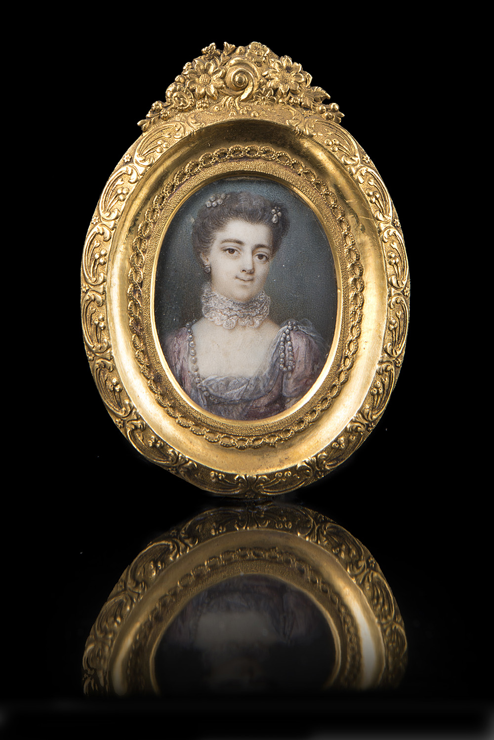 (attr.) "Ritratto di Henrietta Louisa contessa di Pomfret" miniatura ovale (cm 4,5x3,5) In cornice in metallo dorato con iscrizioni incise al retro