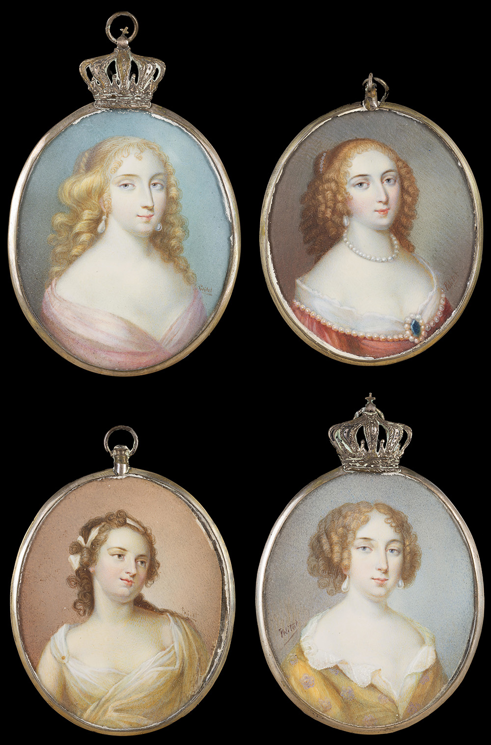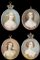 Scuola della fine del secolo XIX. Gruppo di quattro miniature raffiguranti dame (cm 5,5x5) Firmate indistintamente. In cornici con cifre ed etichette di collezione al retro