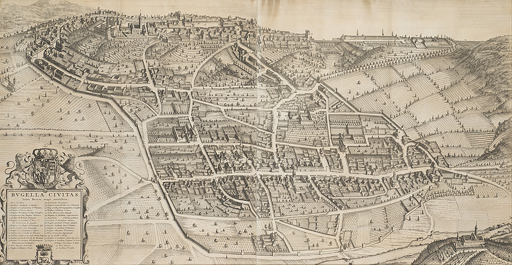 "Bugella Civitas. Index rerum magis notabilium", incisione tratta dal "Theatrum Statuum Sabaudiae" raffigurante la città di Biella, Amsterdam, 1682 (cm 52,5x101). In cornice (difetti)