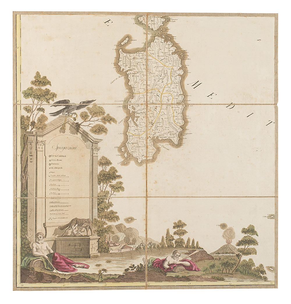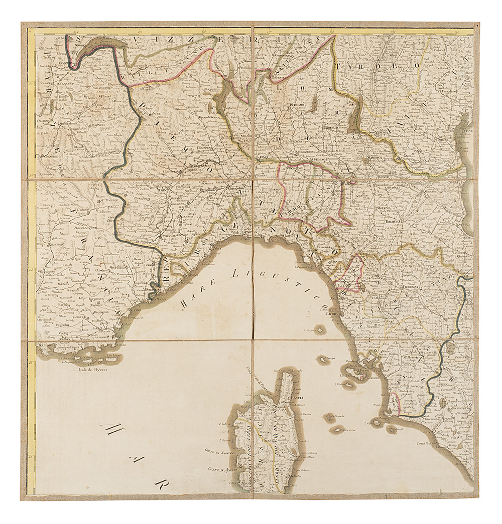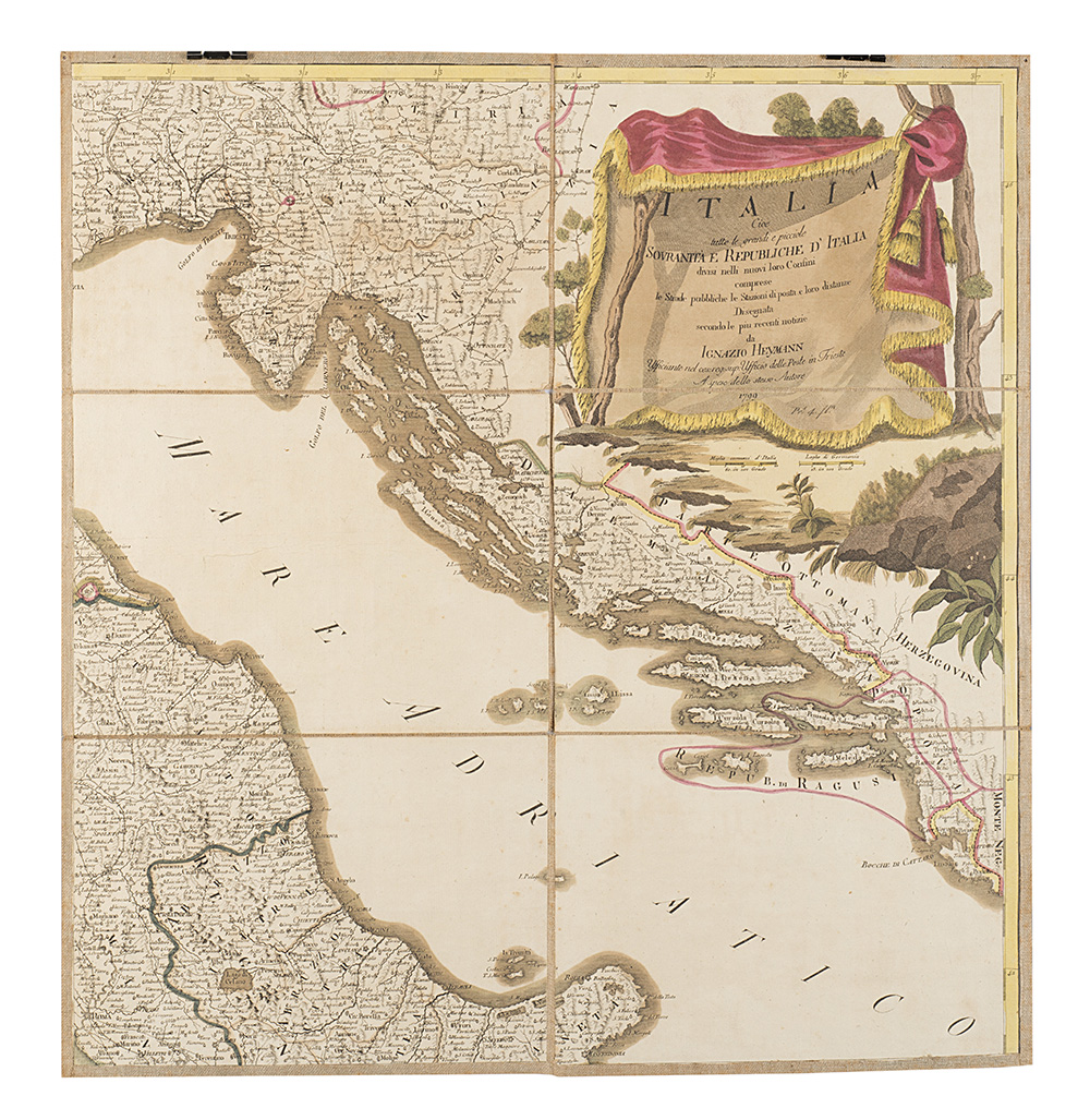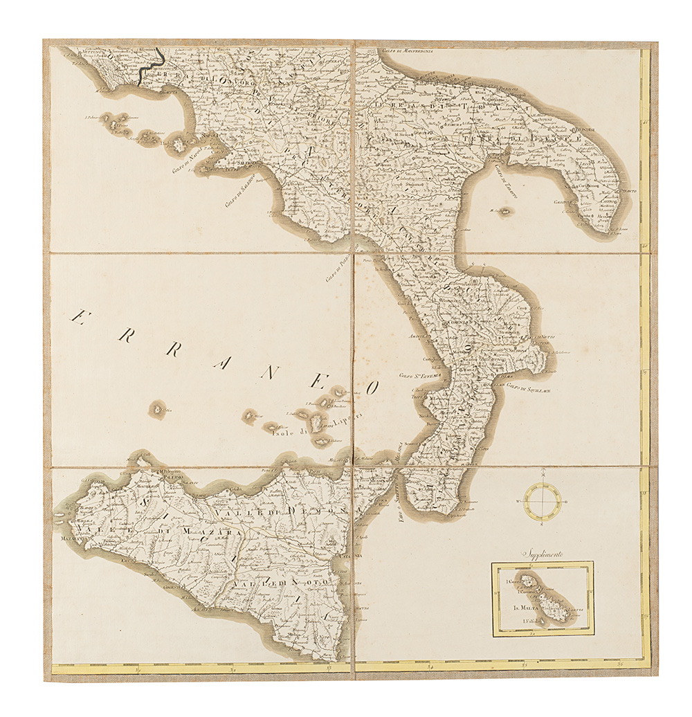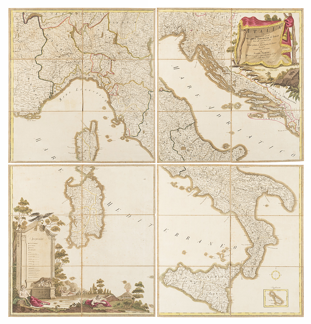Carta geografica dell'Italia composta da ventiquattro fogli montati su quattro supporti di tessuto, datata 1799 (cm 54,1x51,7 ciascun supporto). In custodia (lievi difetti)