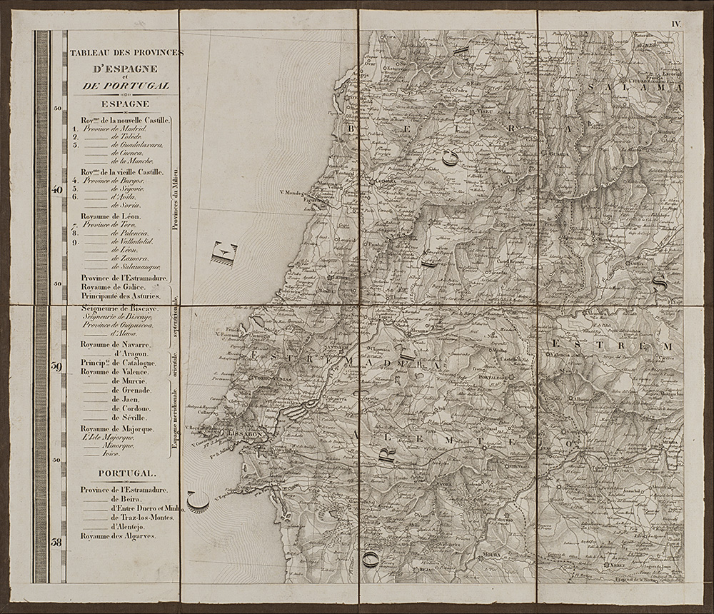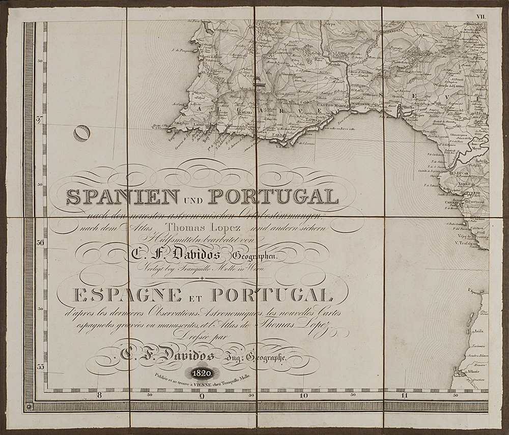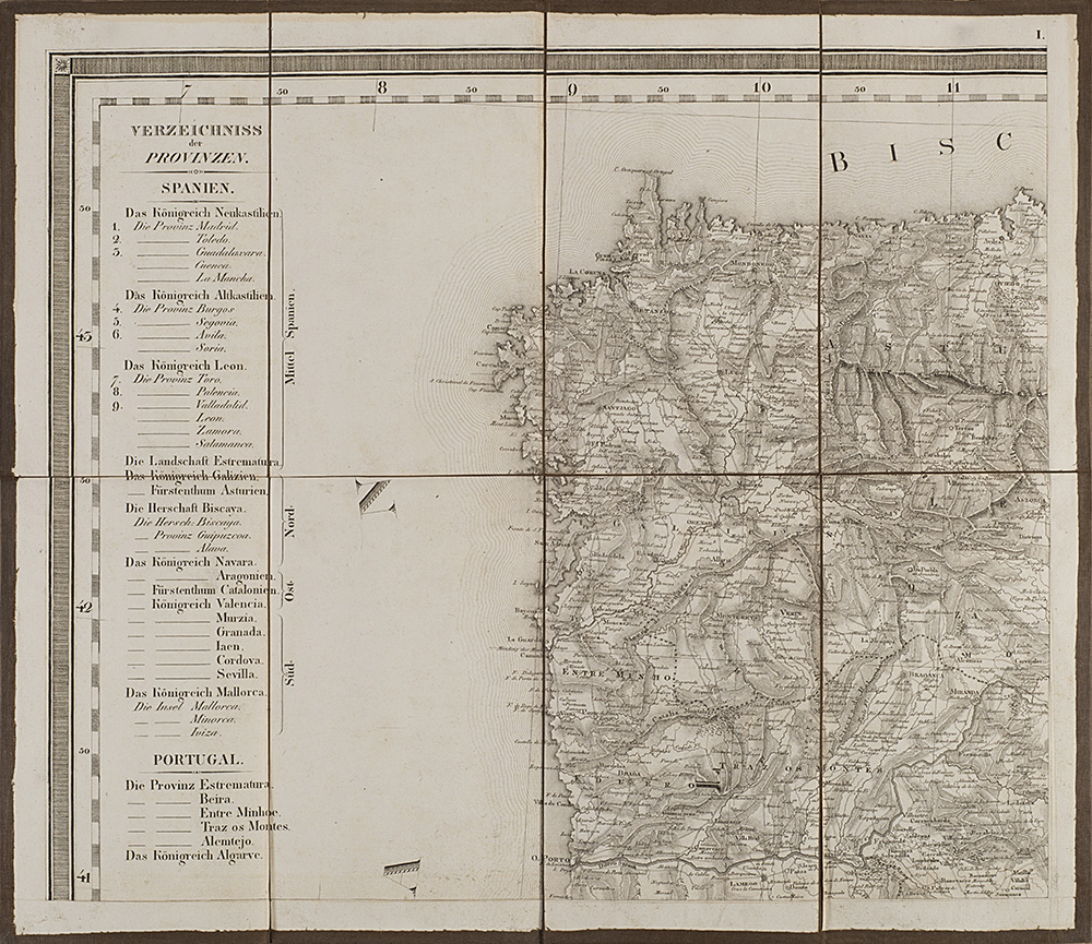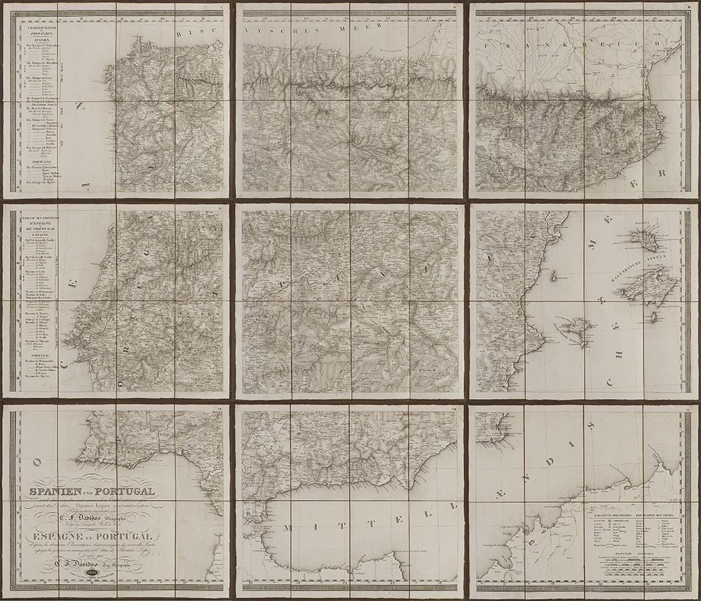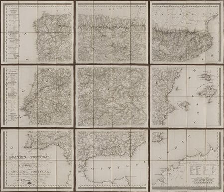 Carta geografica della Spagna e del Portogallo composta da nove carte pieghevoli e intelate, disegnata da C. F. Davidos e pubblicate da Tranquillo Mollo, Vienna, 1820 (cm 41,5x48,5 ciascuna). In custodia cartonata (difetti)
