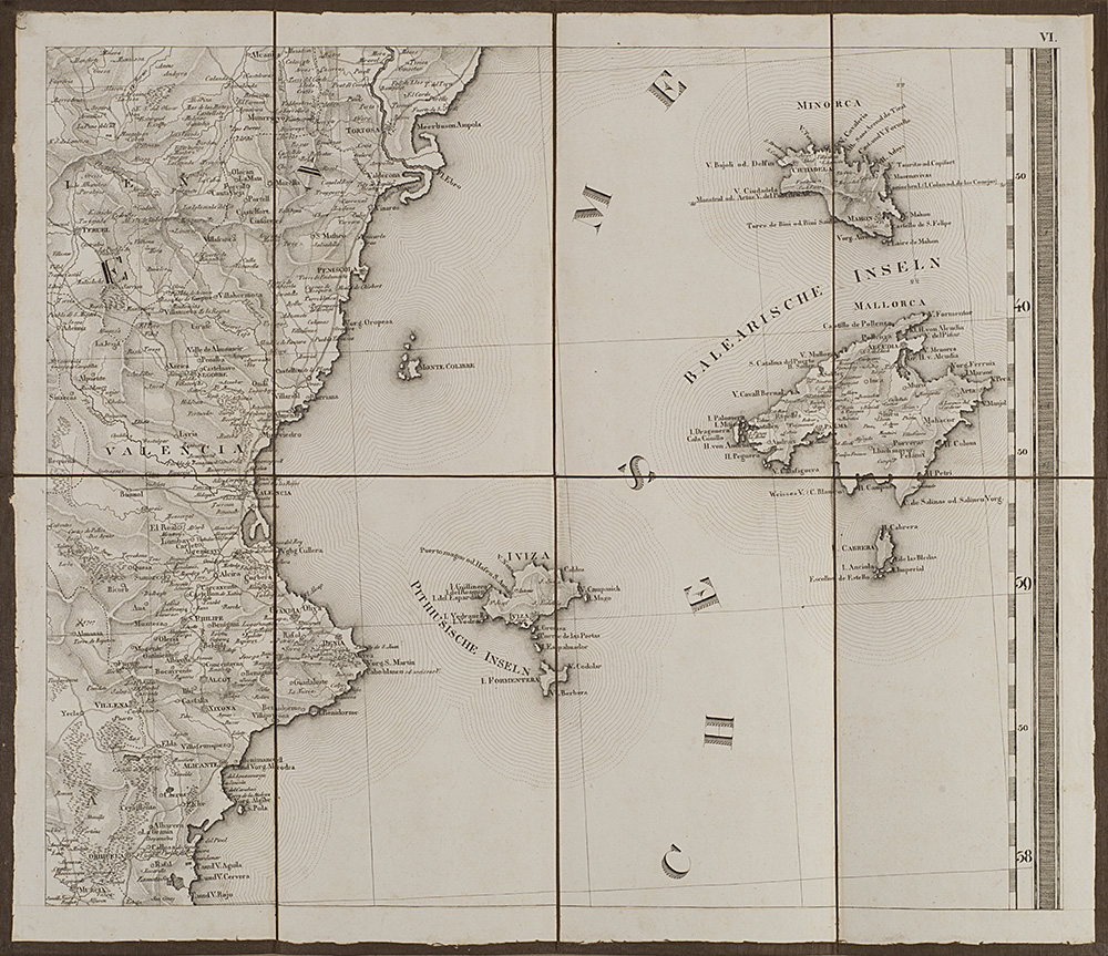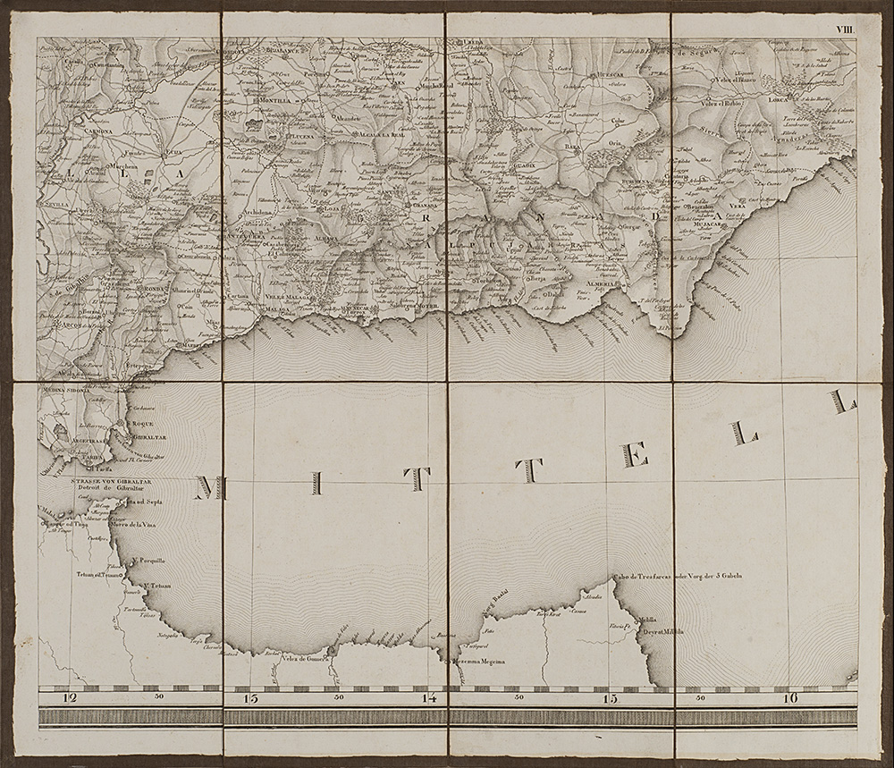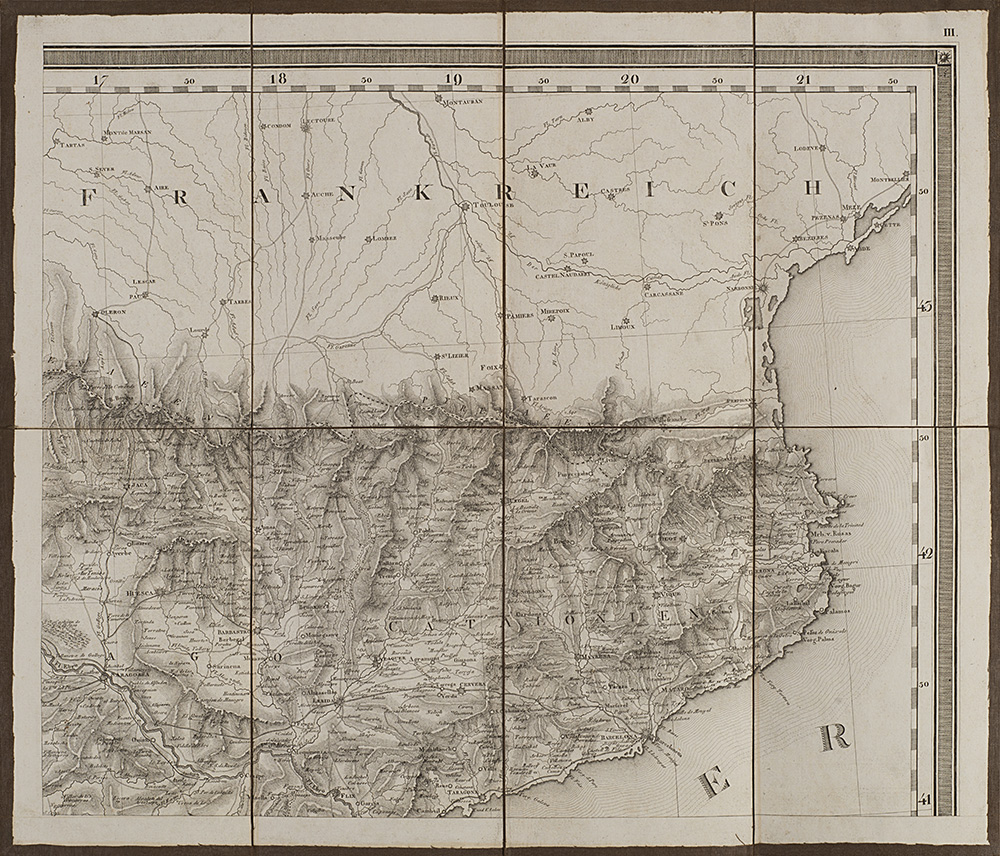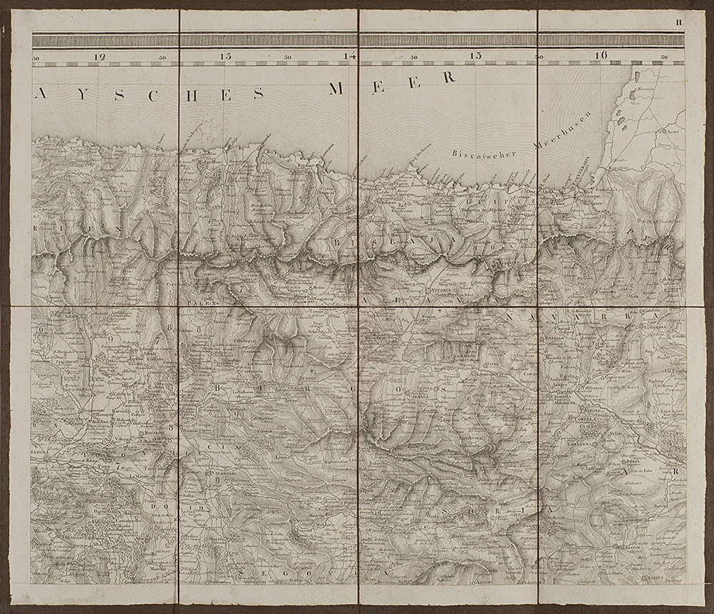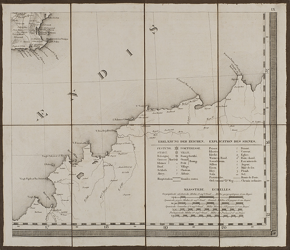 Carta geografica della Spagna e del Portogallo composta da nove carte pieghevoli e intelate, disegnata da C. F. Davidos e pubblicate da Tranquillo Mollo, Vienna, 1820 (cm 41,5x48,5 ciascuna). In custodia cartonata (difetti)