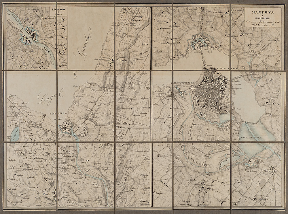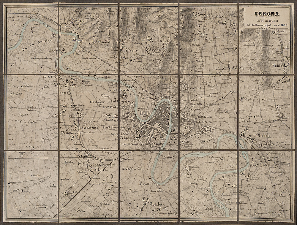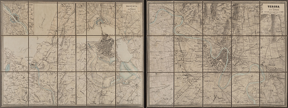 Due carte geografiche pieghevoli e intelate "Mantova e suoi dintorni colle nuove fortificazioni dal 1859-66" e "Verona e suoi dintorni colle nuove fortificazioni eseguite fino al 1866", edite da Borri e Manfredi, Torino, post 1866 (cm 44x59 circa ciascuna). In custodie cartonate editoriali (difetti)