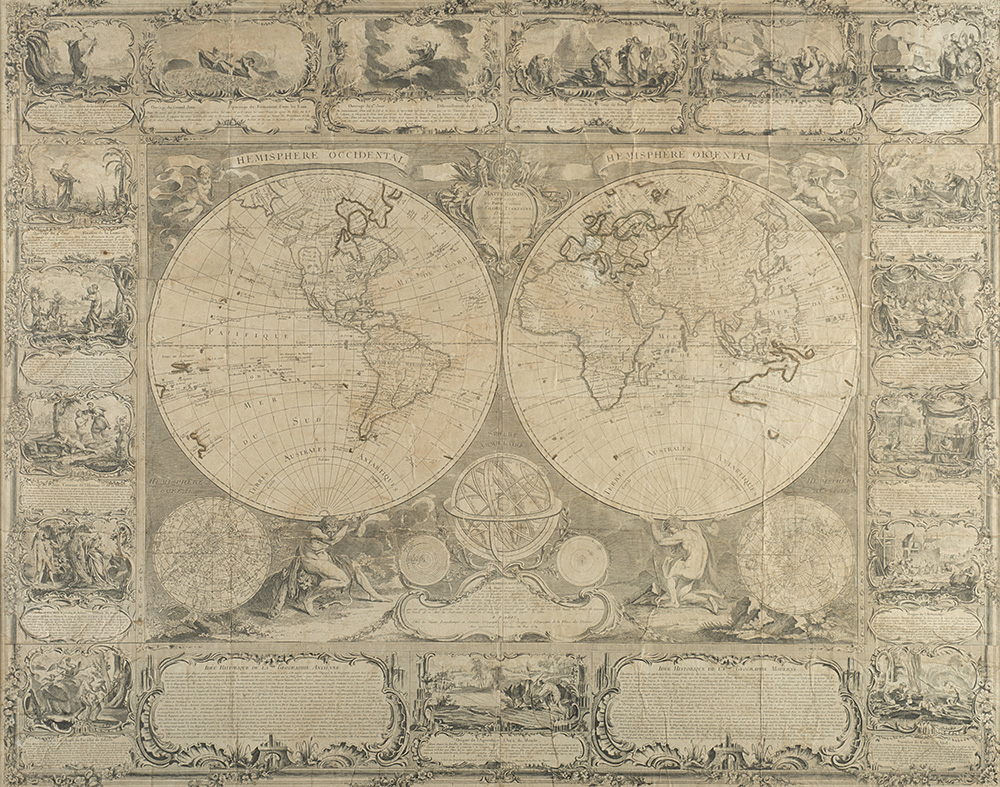 "Mappemonde contenant les partes connues du globe terrestre" etching printed on more sheets depicting the Eastern and Western hemispheres surrounded by episodes of the Old Testament, Paris, 1754 (119x148 cm. circa). Framed (defects and restorations)