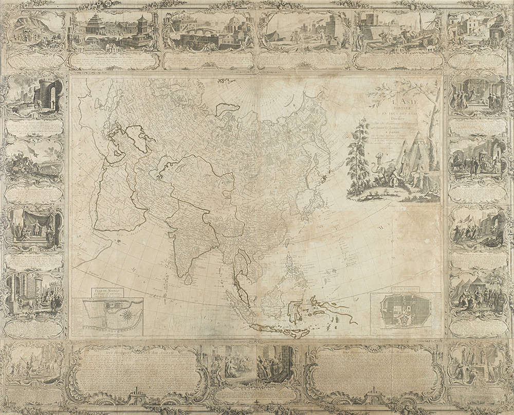 "L'Asie divisée en tous ses etats" incisione stampata su più fogli contornata da vignette inerenti episodi della storia del continente asiatico, Parigi, 1754 (cm 119x148 circa). In cornice (difetti e restauri)