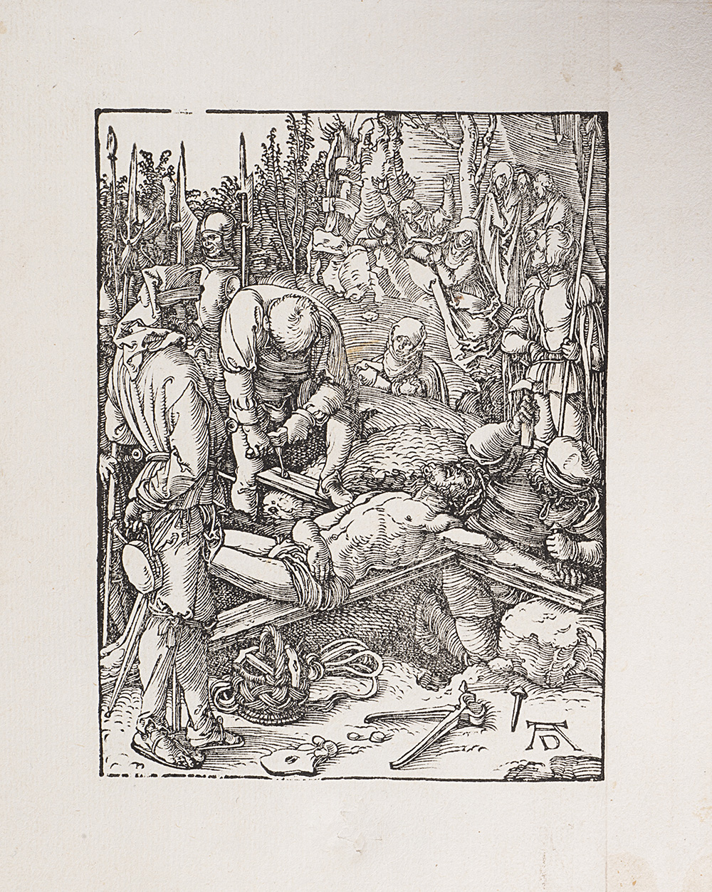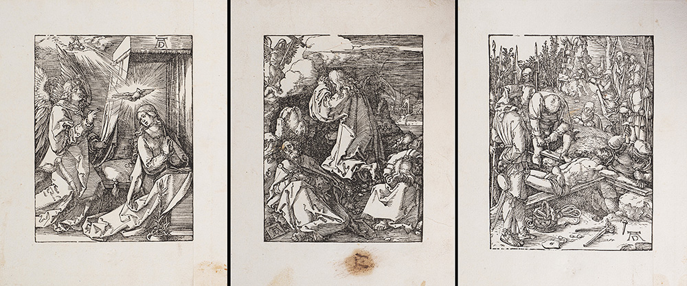 Gruppo di tre xilografie dal ciclo della "Piccola Passione" raffiguranti "Annunciazione", "Orazione nell'orto" e "Cristo inchiodato alla croce", della prima edizione dopo il testo latino, in montaggio antico su un altro foglio di carta (mm 127x97 circa alla linea di inquadramento)