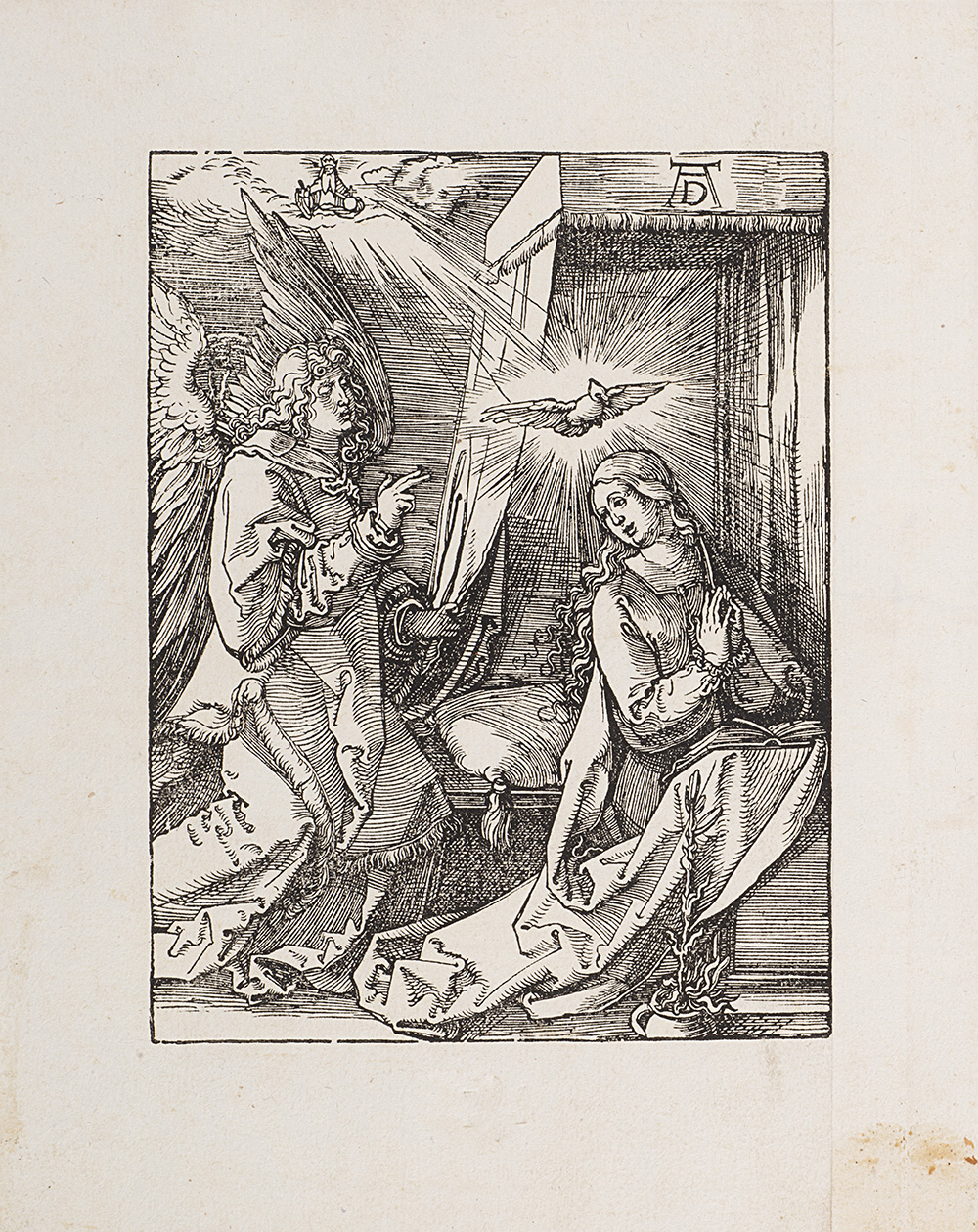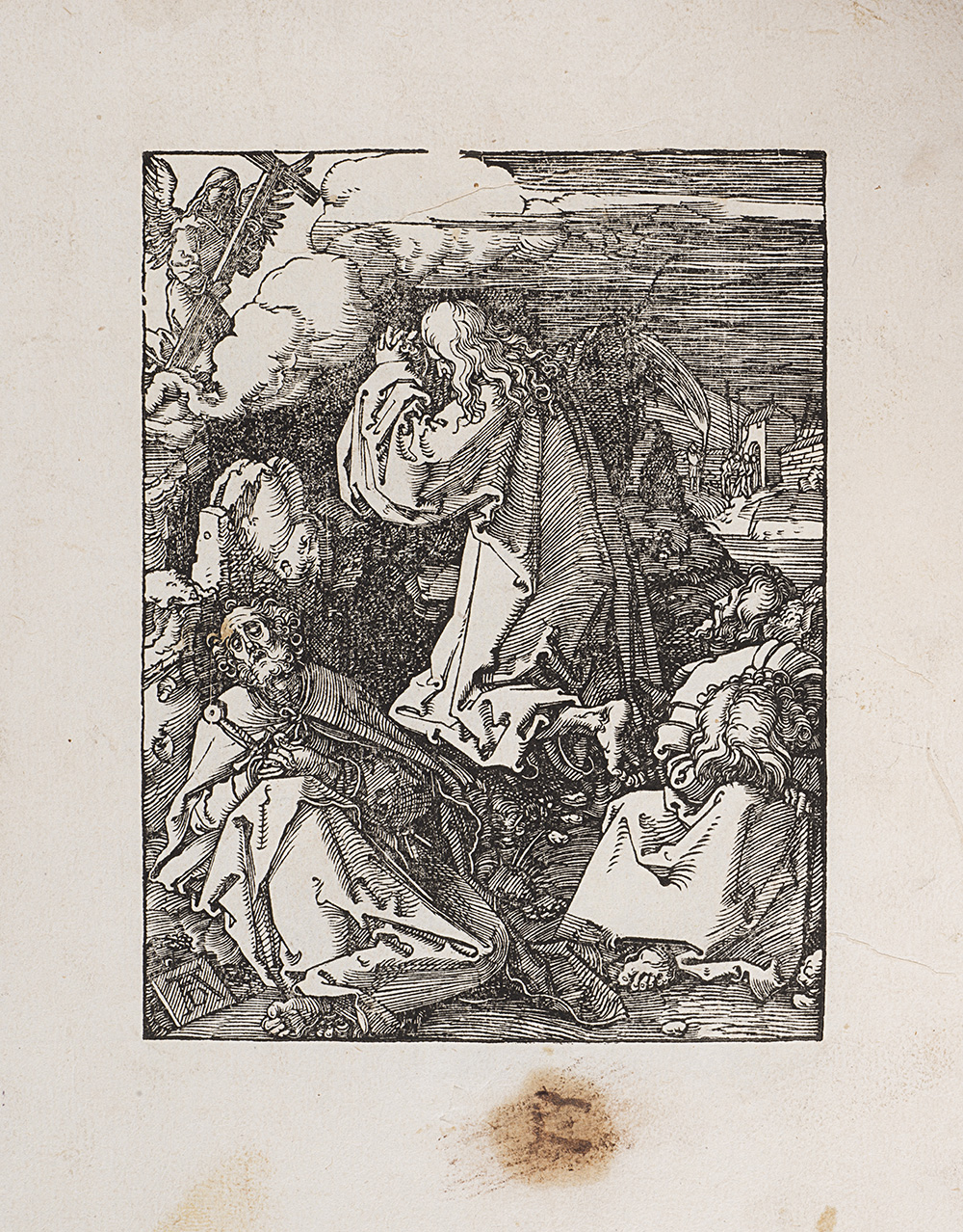 Group of three woodcuts from " The Small Passion": "Annunciation", "Agony in the Garden" and "Nailing to the Cross", first edition after the latin text, laid on an old mounting (127x97 mm. circa to the borderline). "Annunciation" is on paper with traces of the watermark "Medium Sized Imperial Orb"