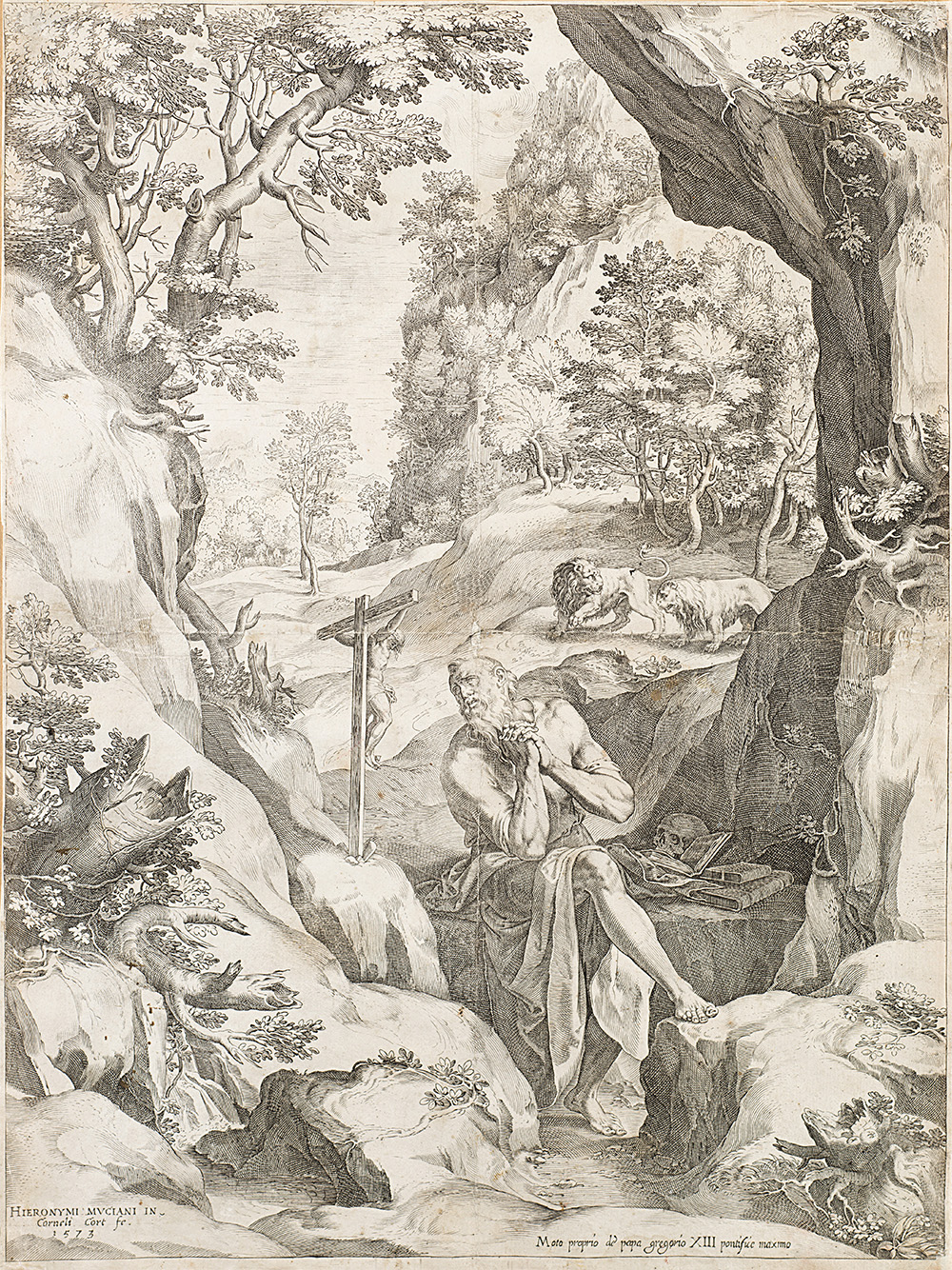 "Saint Jerome" after Girolamo Muziano, engraving on paper with indistinct watermark (505x377 mm. circa). Signed and dated in plate "Corneli Cort fe. 1573". Framed (defects and restorations)