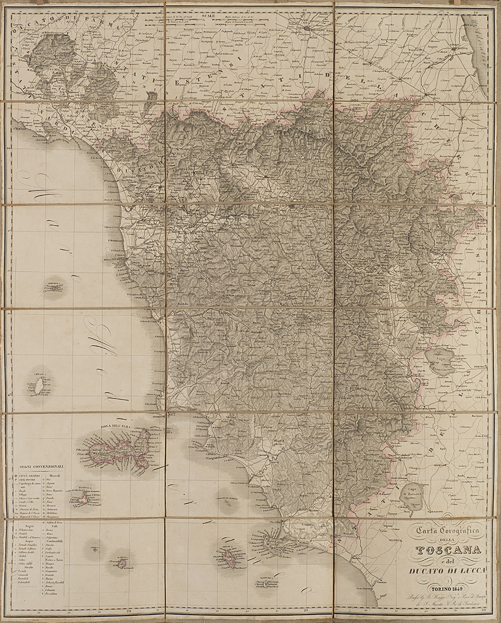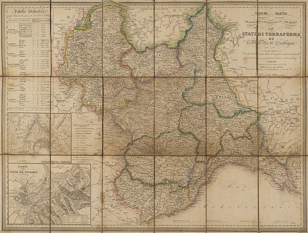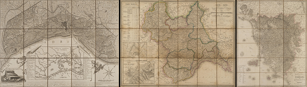 Tre carte geografiche pieghevoli ed intelate: "Carta geografica della Toscana e del Ducato di Lucca" edita da Giò Battista Maggi, Torino, 1838 (cm 68,5x55,5); "Nuova Carta geografica, statistica e stradale degli Stati di Terraferma di S.M il Re di Sardegna" , A. Stucchi, Torino, 1832 (cm 55x72); "La Laguna Veneta antica e moderna sotto il dominio Austriaco..." edita dai Vallardi, Milano, 1836 (cm 45,5x61,5). In custodie editoriali (difetti)