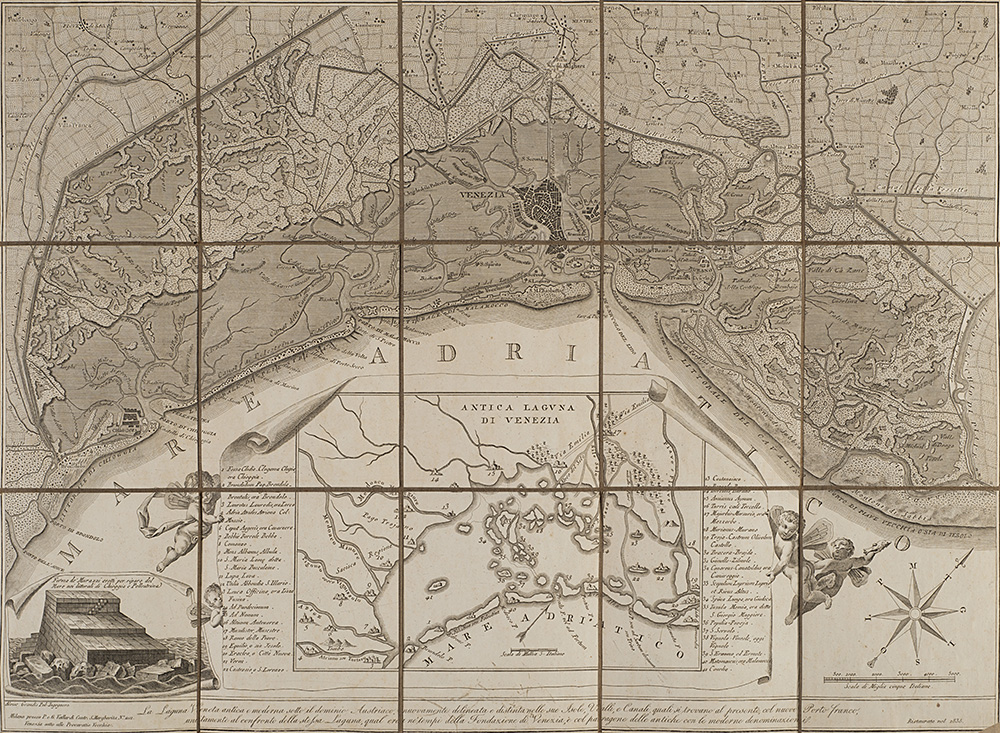 Three folding maps applied on canvas: "Carta geografica della Toscana e del Ducato di Lucca" published by Giò Battista Maggi, Turin, 1838 (cm 68.5x55.5); "Nuova Carta geografica, statistica e stradale degli Stati di Terraferma di S.M il Re di Sardegna" , A. Stucchi, Turin, 1832 (cm 55x72); "La Laguna Veneta antica e moderna sotto il dominio Austriaco..." published by Vallardi, Milan, 1836 (cm 45.5x61.5). With cases (defect)