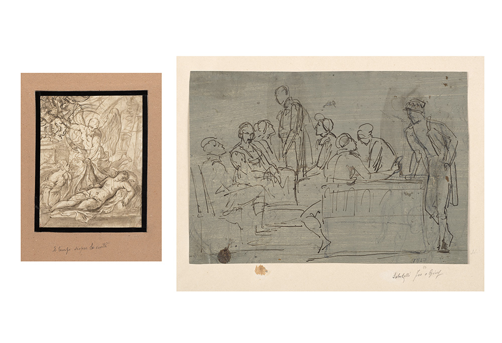Penna, pennello e inchiostro bruno (recto); penna e inchiostro bruno e tracce a matita nera (verso) su carta inserita in montaggio, mm 202x158 circa