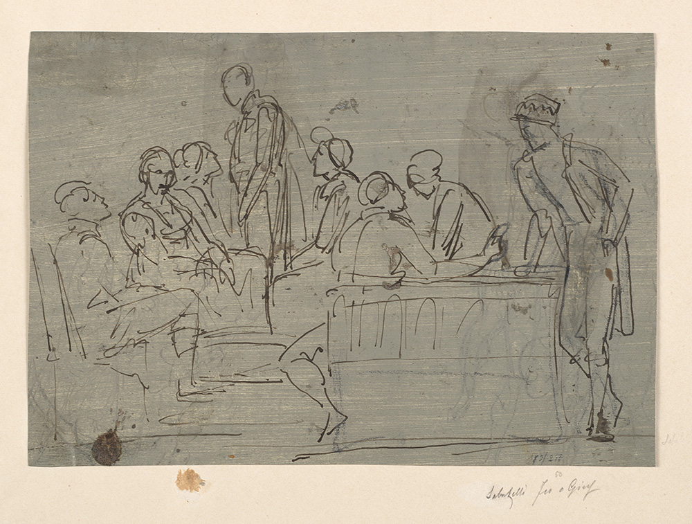 Pen, brush and brown ink (recto); pen, brown ink and traces in black chalk (verso) on paper in a mounting, 202x158 mm.