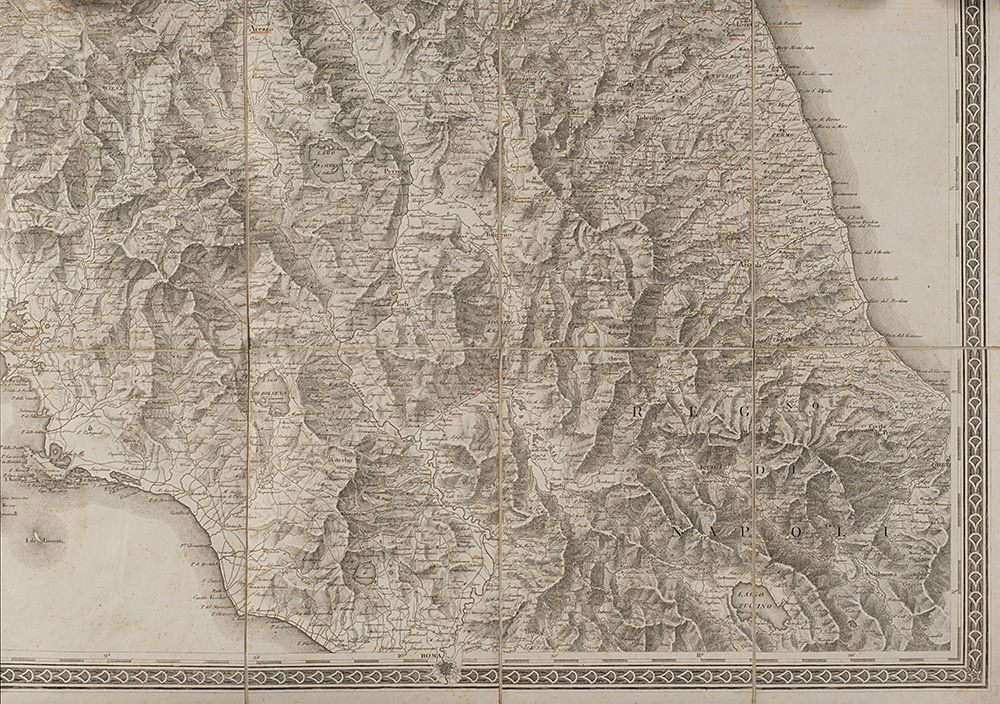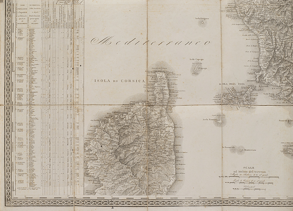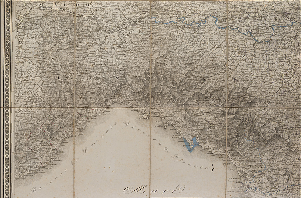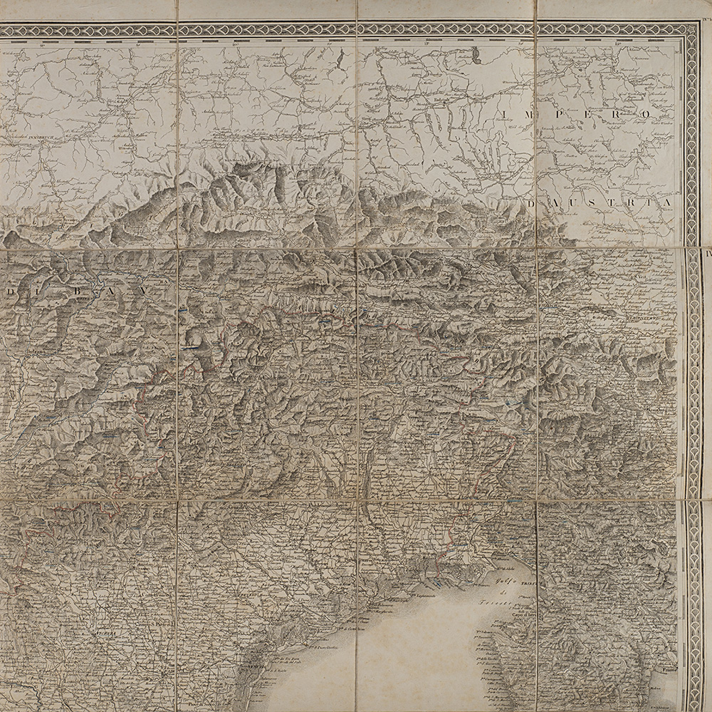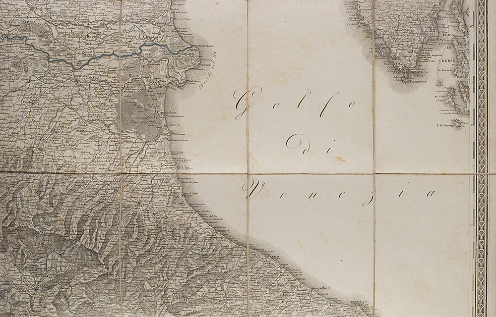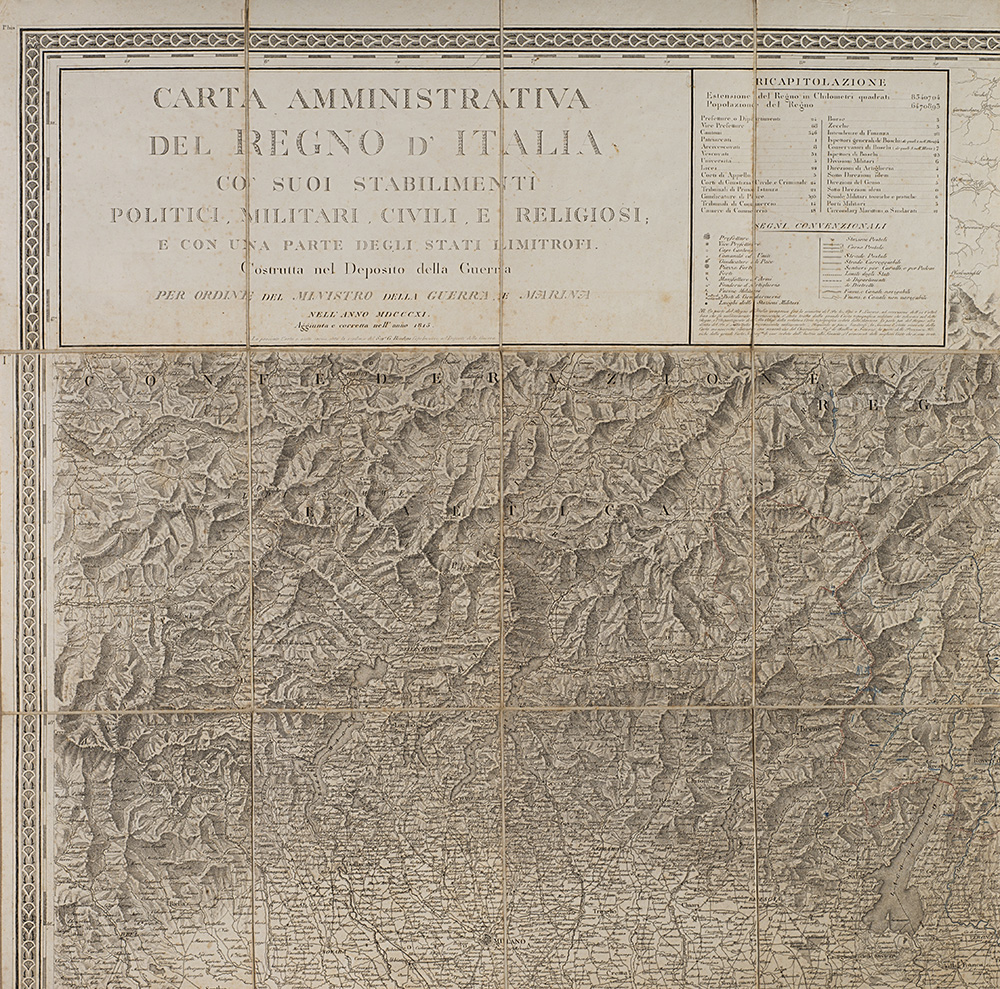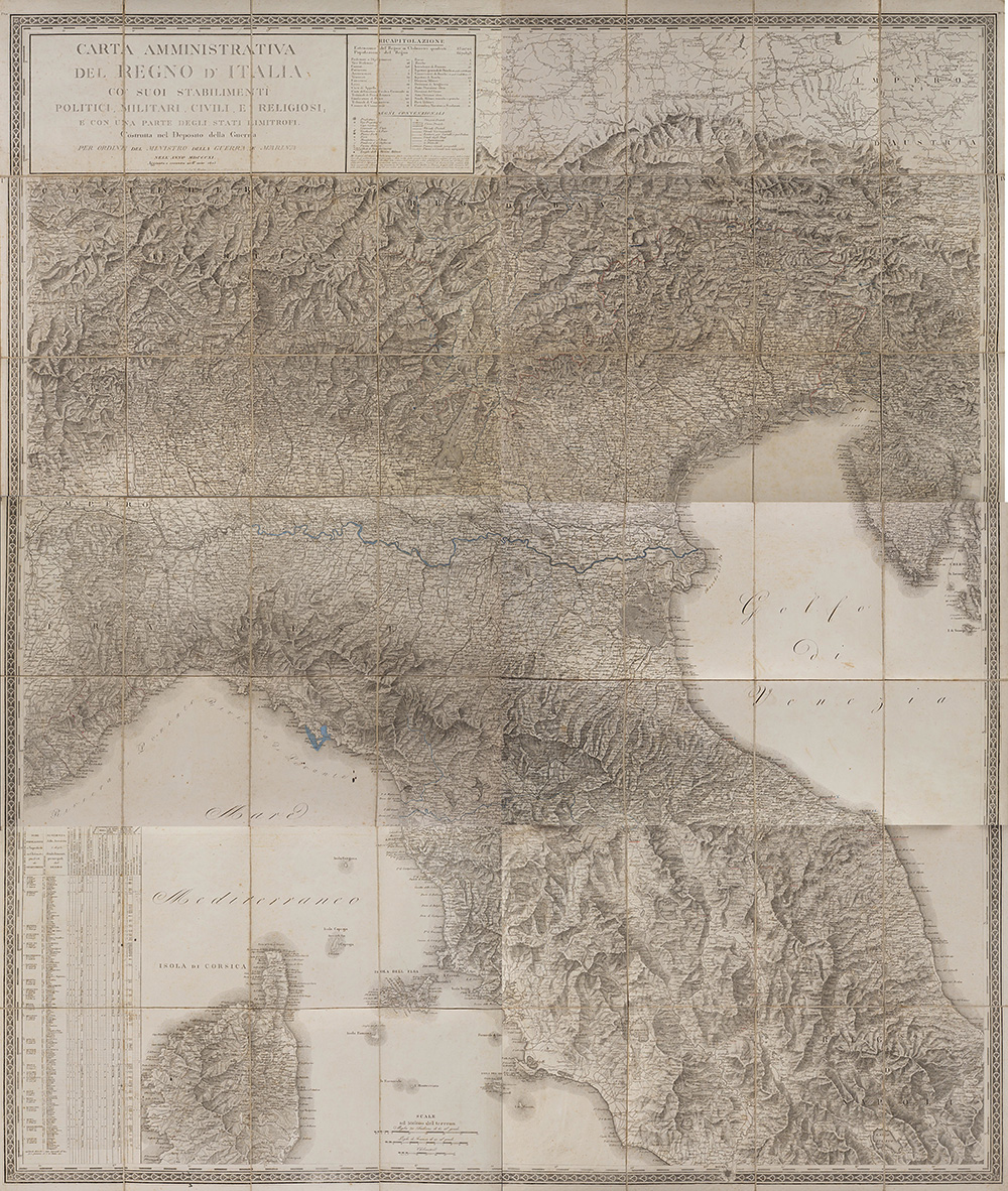 "Carta amministrativa del Regno d'Italia co suoi stabilimenti politici, militari, civili e religiosi e con una parte degli stati limitrofi" composta da sei carte pieghevoli e intelate inerenti i territori di Milano, Cremona, Livorno, Venezia, Bologna e Fermo, incise sotto la supervisione di Gaudenzio Bordiga, Milano, 1813. In custodia editoriale (difetti)