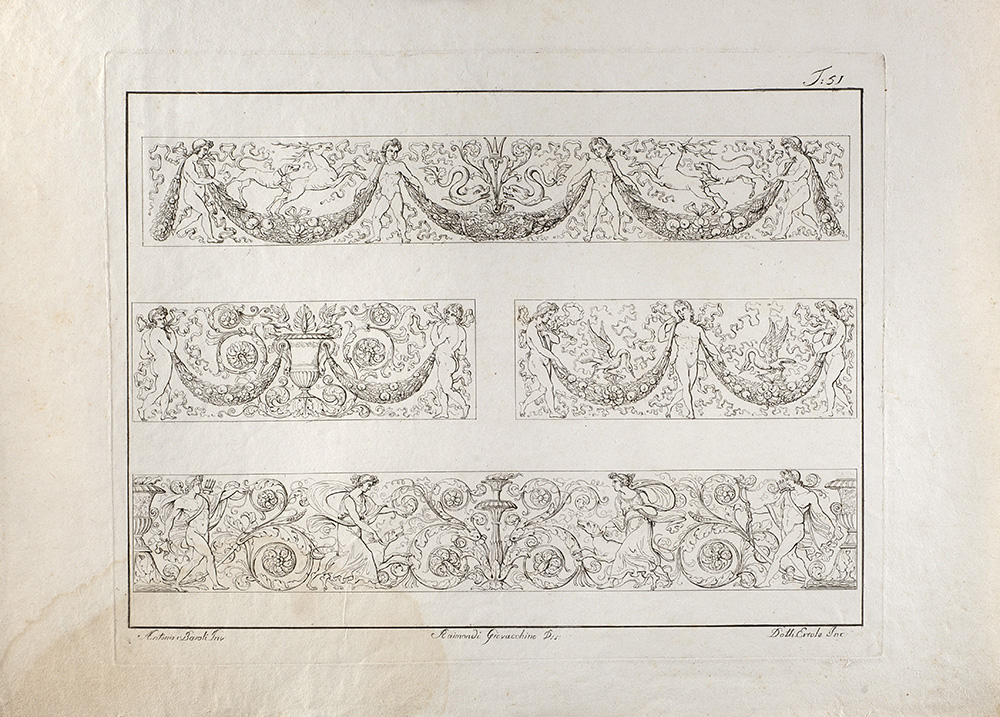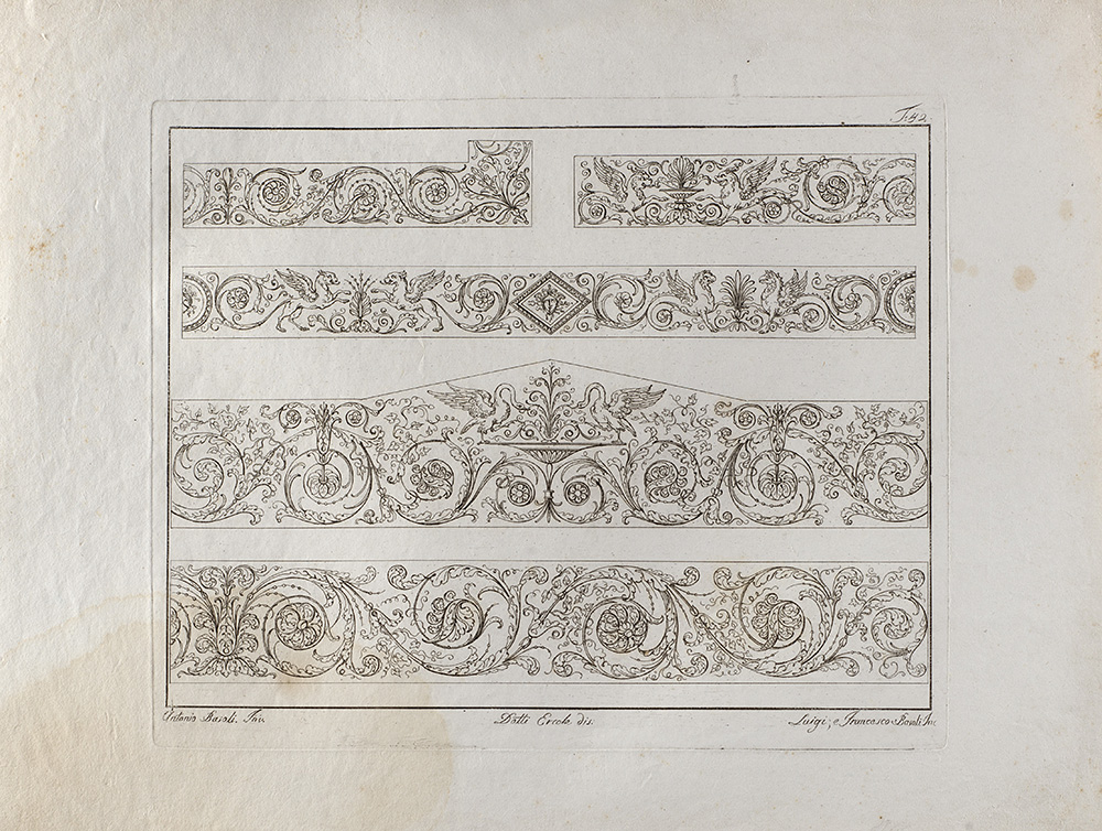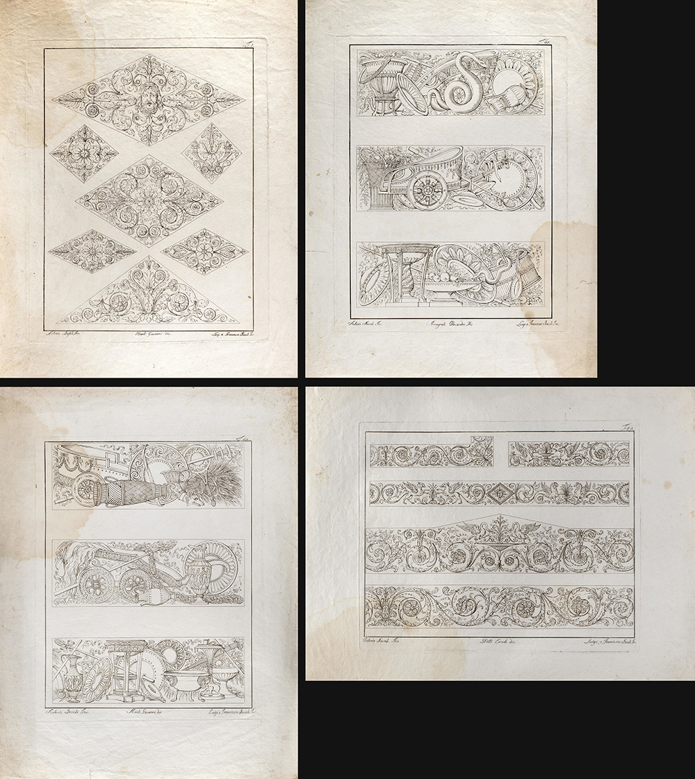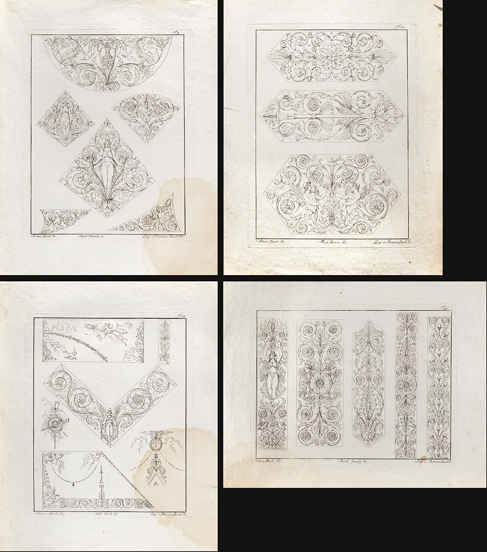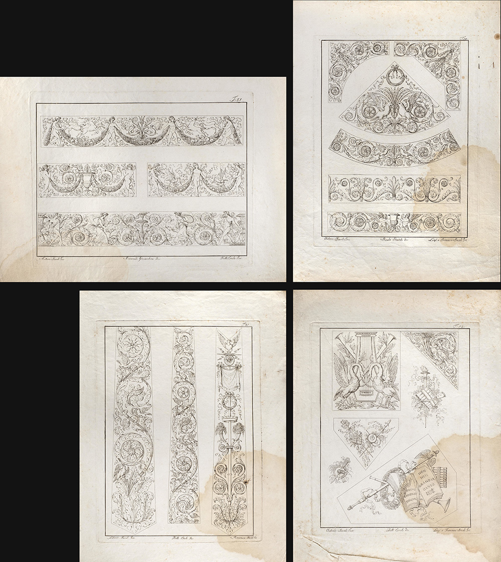 Lot composed of nineteen etchings depicting studies for ornamental motif, invented by Antonio Basoli and engraved by Luigi e Antonio Basoli (40x30 cm. circa to the plate) (defects); and a similar one of smaller size (15x20 cm. circa to the platemark)