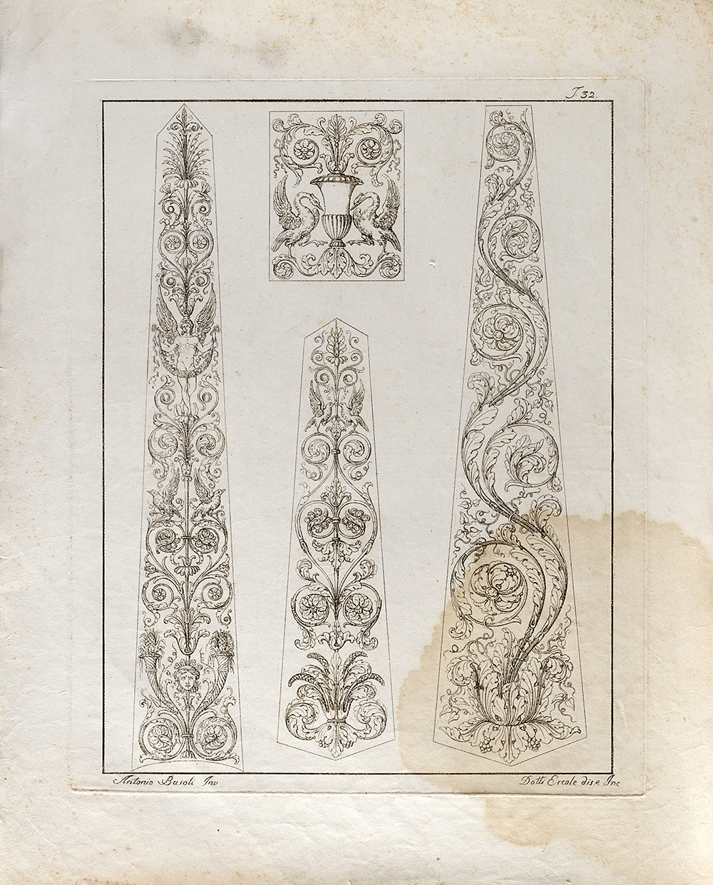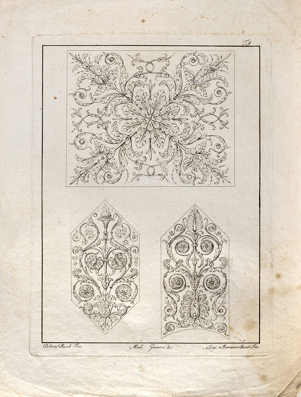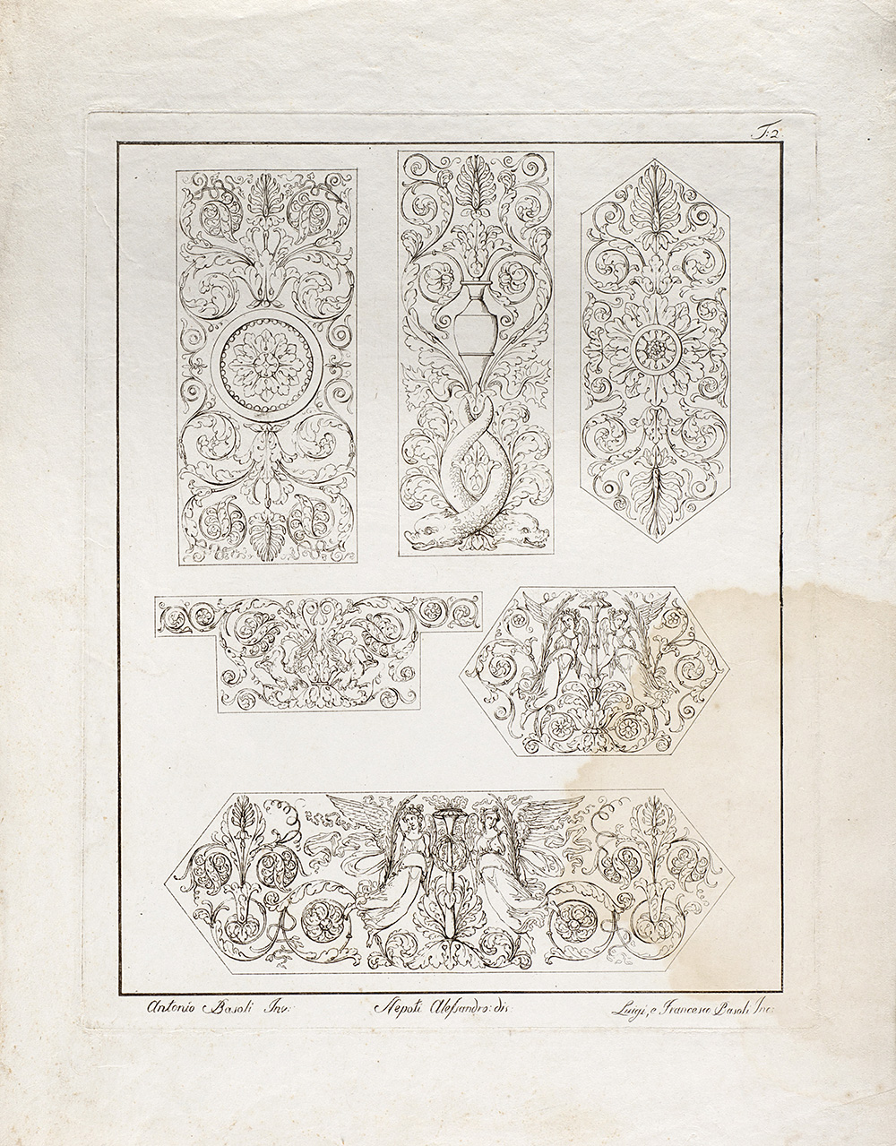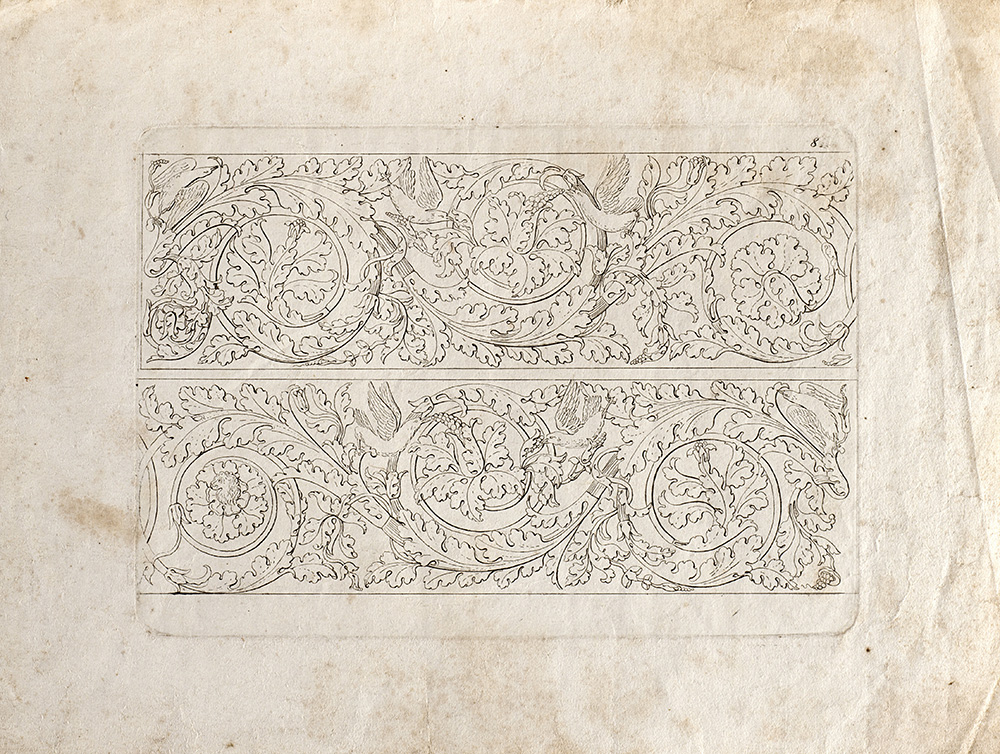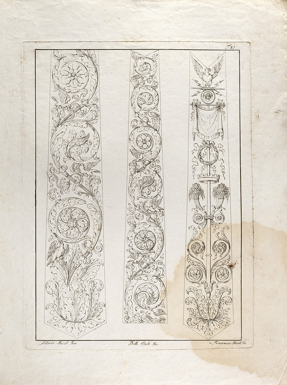 Lot composed of nineteen etchings depicting studies for ornamental motif, invented by Antonio Basoli and engraved by Luigi e Antonio Basoli (40x30 cm. circa to the plate) (defects); and a similar one of smaller size (15x20 cm. circa to the platemark)