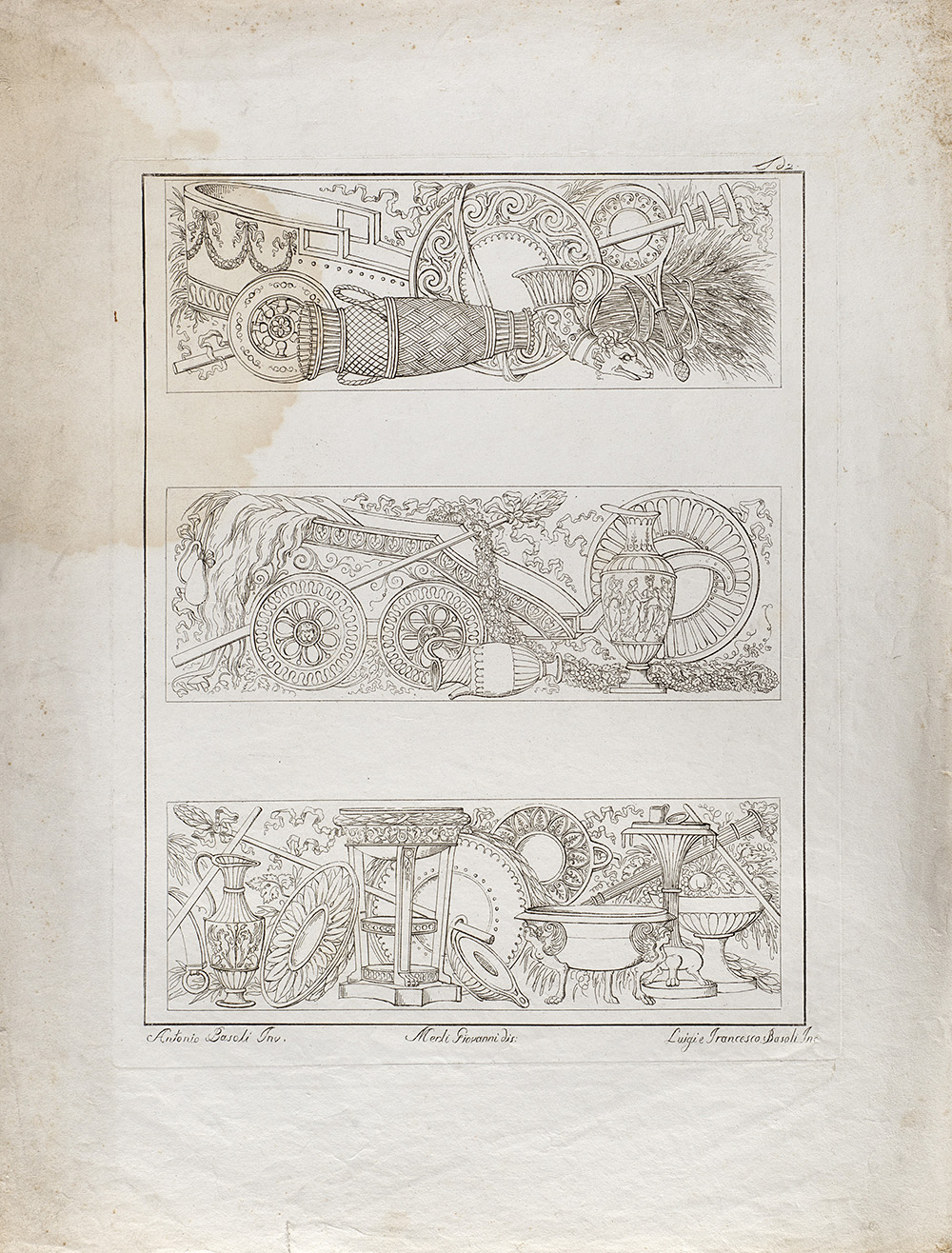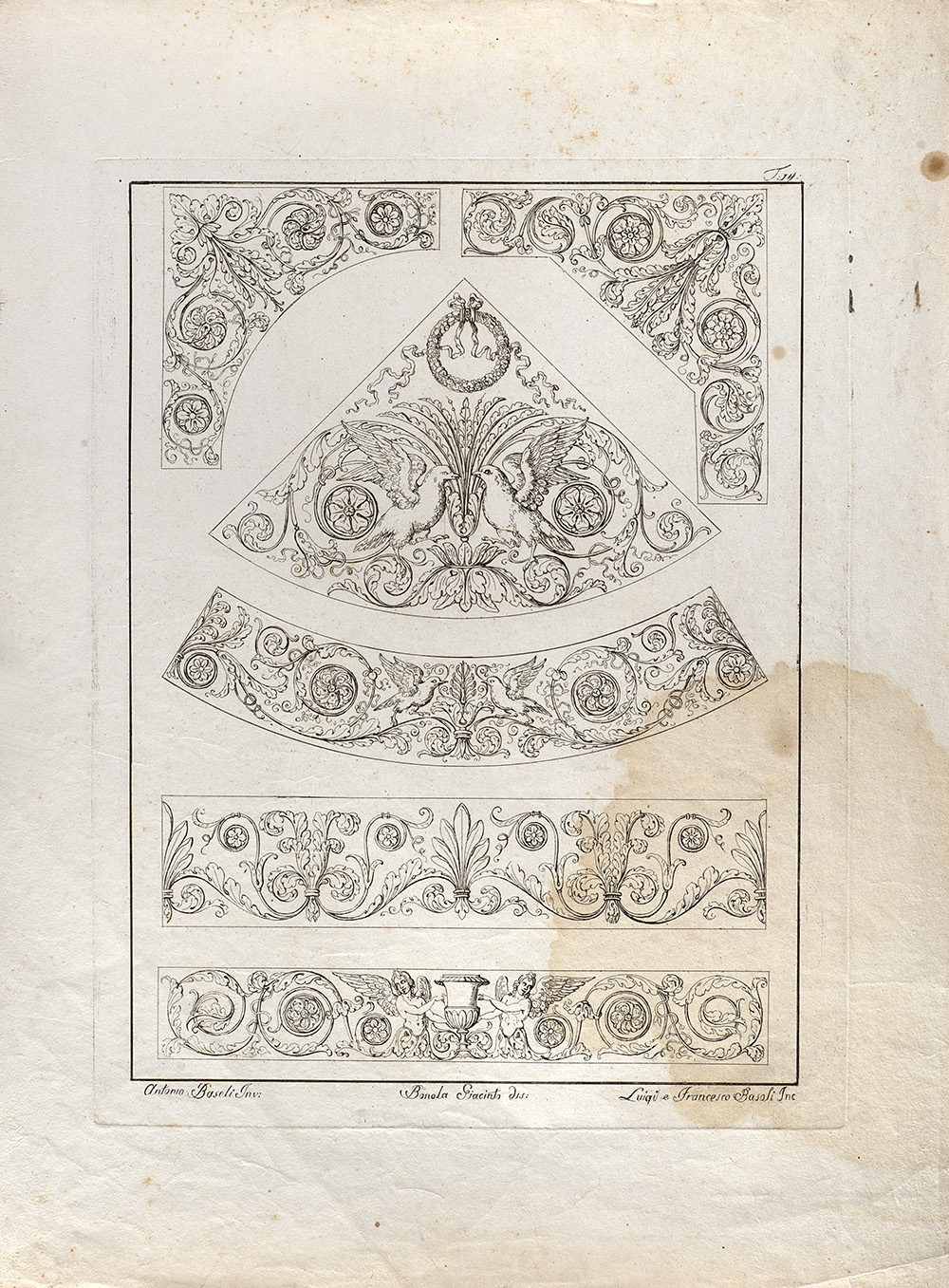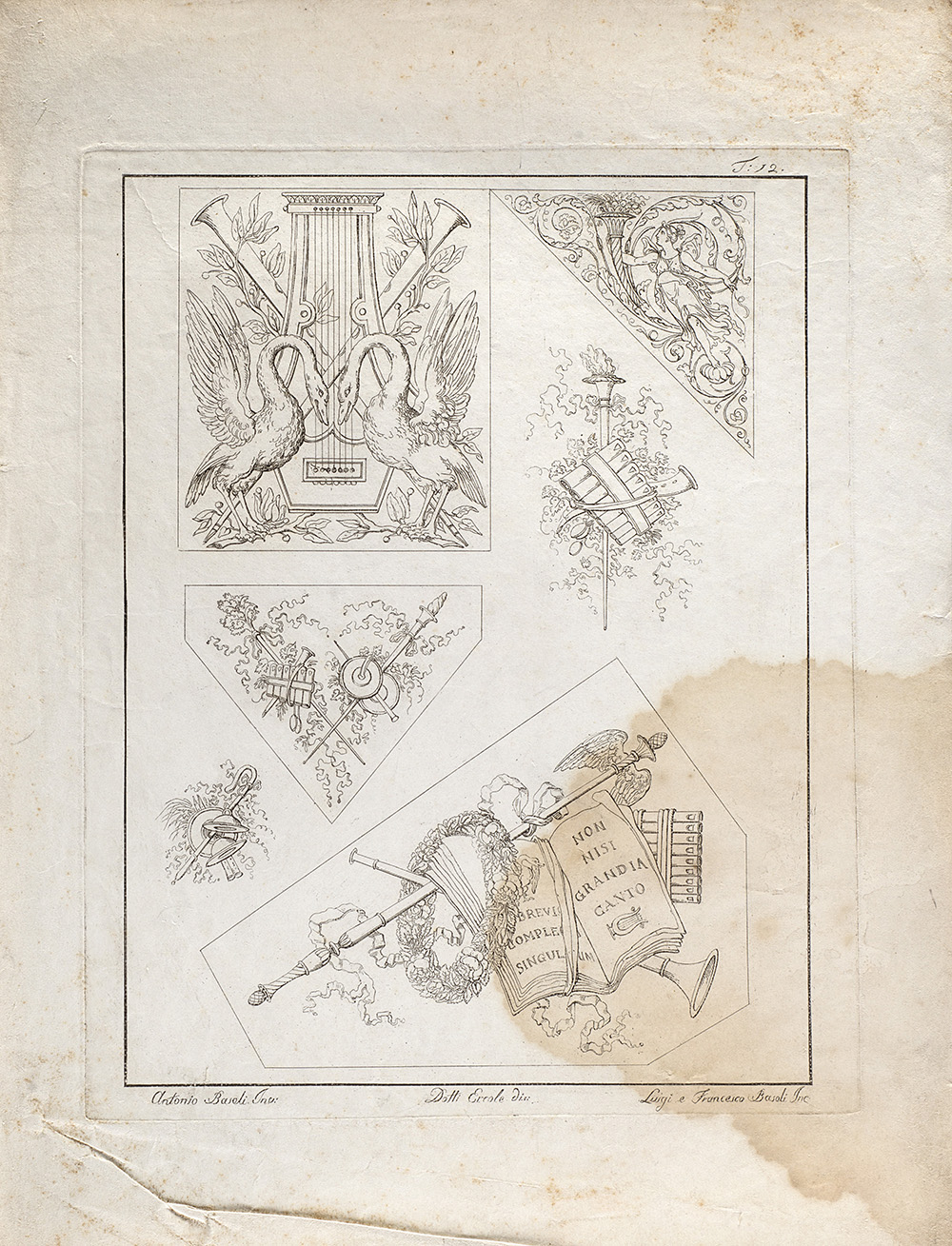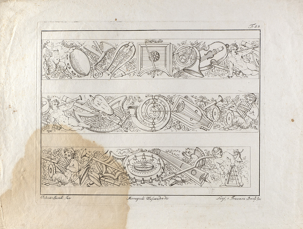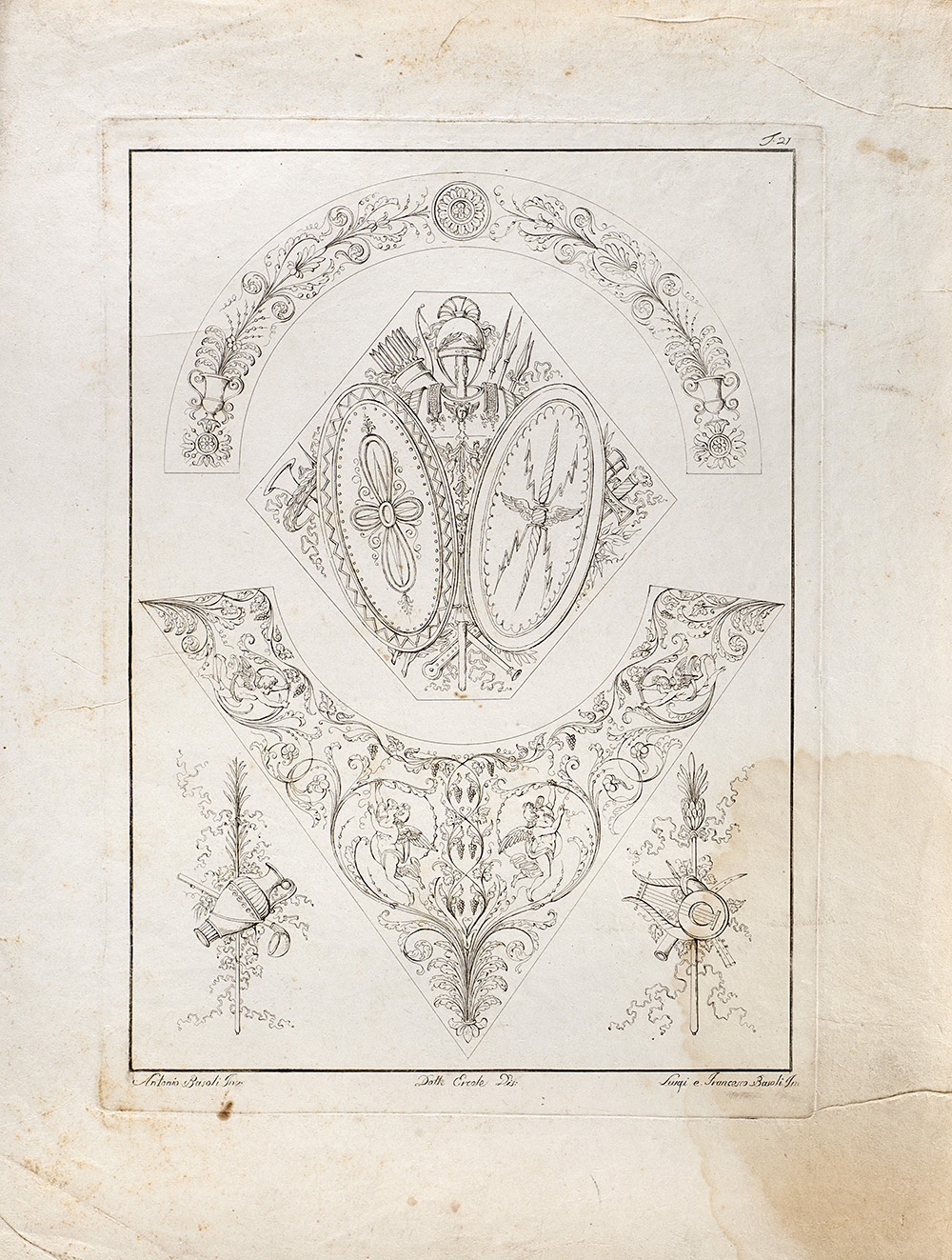 Lotto composto da diciannove incisioni raffiguranti studi di decorazione, da invenzione di Antonio Basoli e incise dai fratelli Luigi e Francesco Basoli (cm 40x30 circa all'impronta) (difetti); più un'incisione di simile soggetto di formato più piccolo (cm 15x20 circa all'impronta)