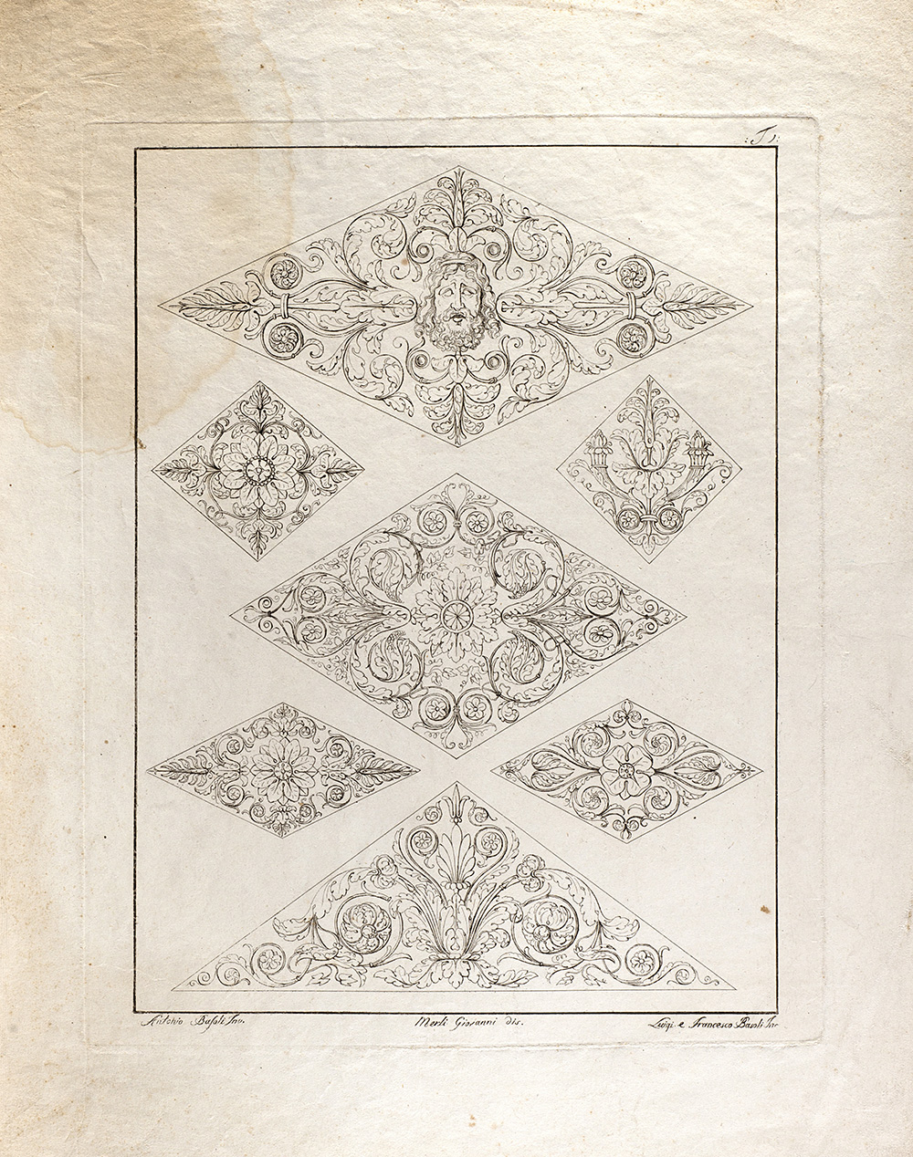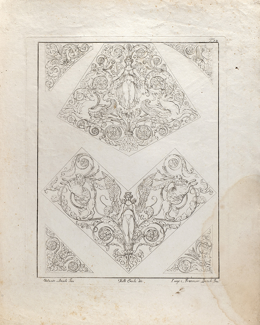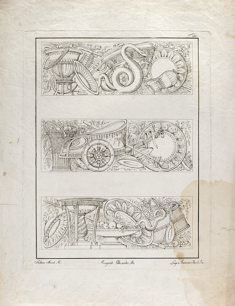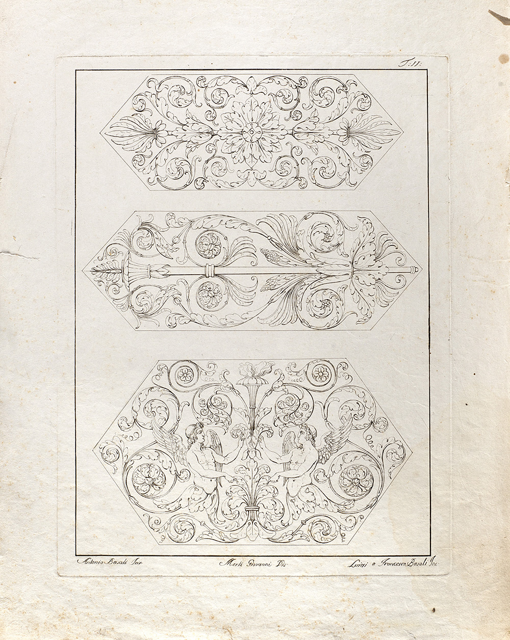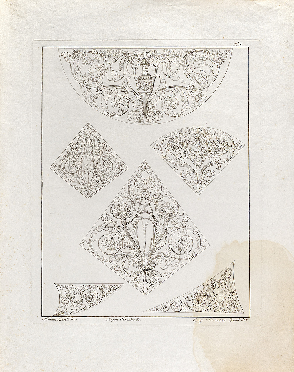 Lotto composto da diciannove incisioni raffiguranti studi di decorazione, da invenzione di Antonio Basoli e incise dai fratelli Luigi e Francesco Basoli (cm 40x30 circa all'impronta) (difetti); più un'incisione di simile soggetto di formato più piccolo (cm 15x20 circa all'impronta)