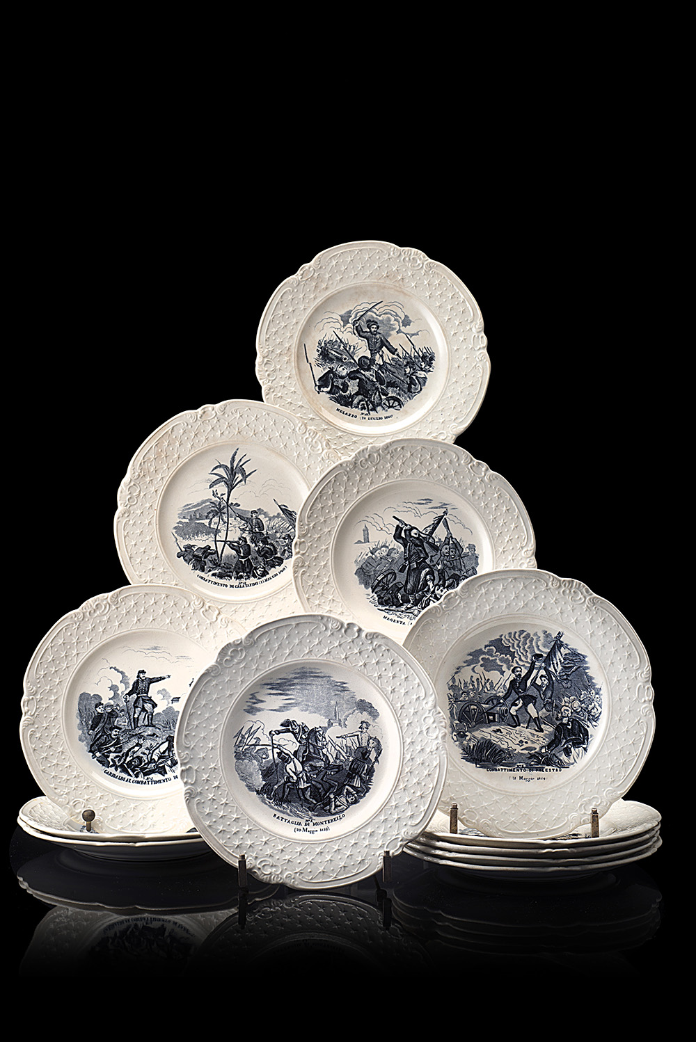 Series of twelve white enameled ceramic plates decorated with monochromatic feats of arms of the Risorgimento. Last quarter of the 19th century (d.20.5 cm) (minor defects)