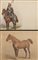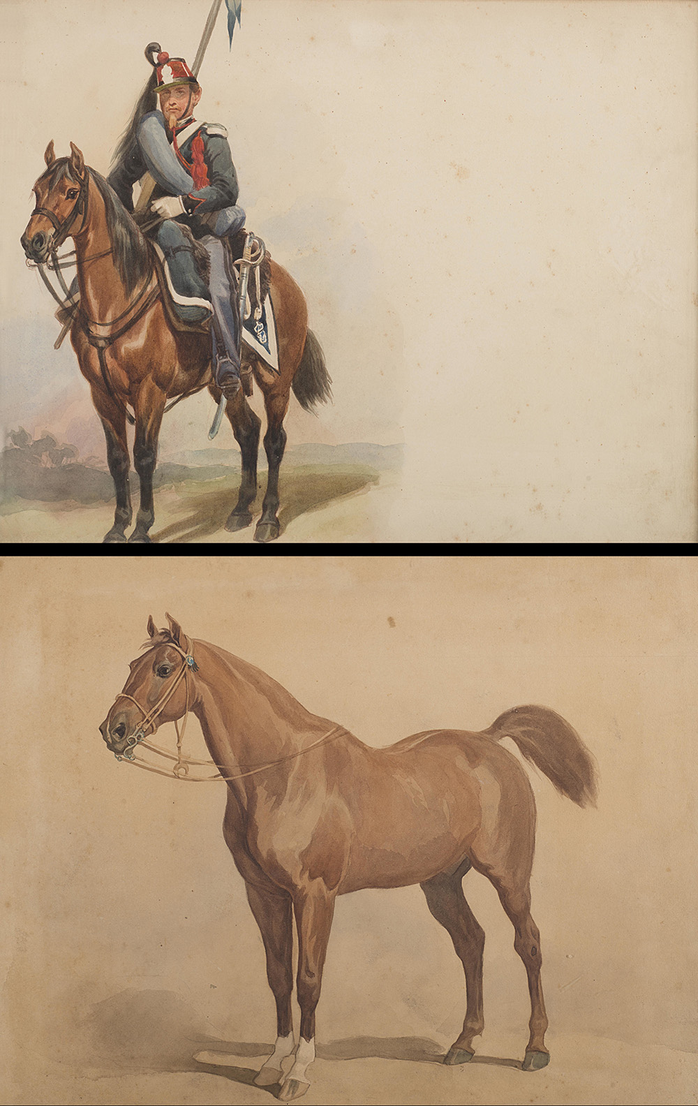 Lotto composto da due acquerelli attribuiti a Stanislao Grimaldi Conte del Poggetto raffigurantiun lanciere e lo studio di un cavallo. Terzo quarto del secolo XIX (cm 37x47,5)
