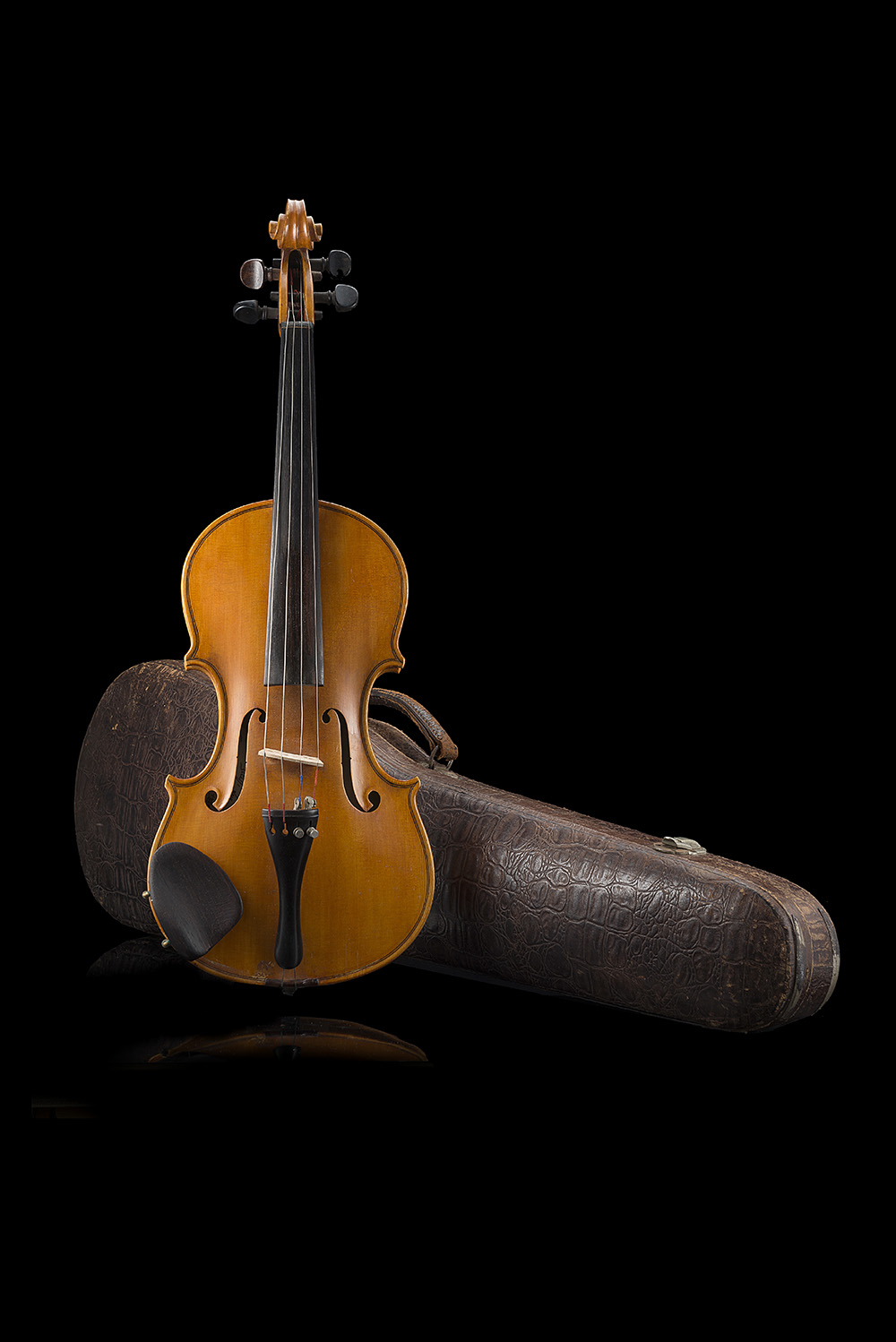 Fondo in due pezzi con marezzatura di larghezza media discendente dalla giunta, vernice di colore arancio dorato, in discrete condizioni, etichetta «Dino Filippi fece / Cesena anno 1976»(lunghezza del fondo mm 356). Con custodia