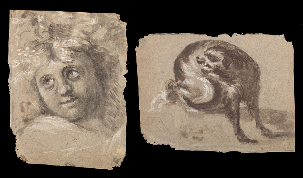 17th-century school "Study for a dog. Portrait of a lady on the verso" watercolours and white lead on paper (mm 140x318) Framed (defects)