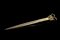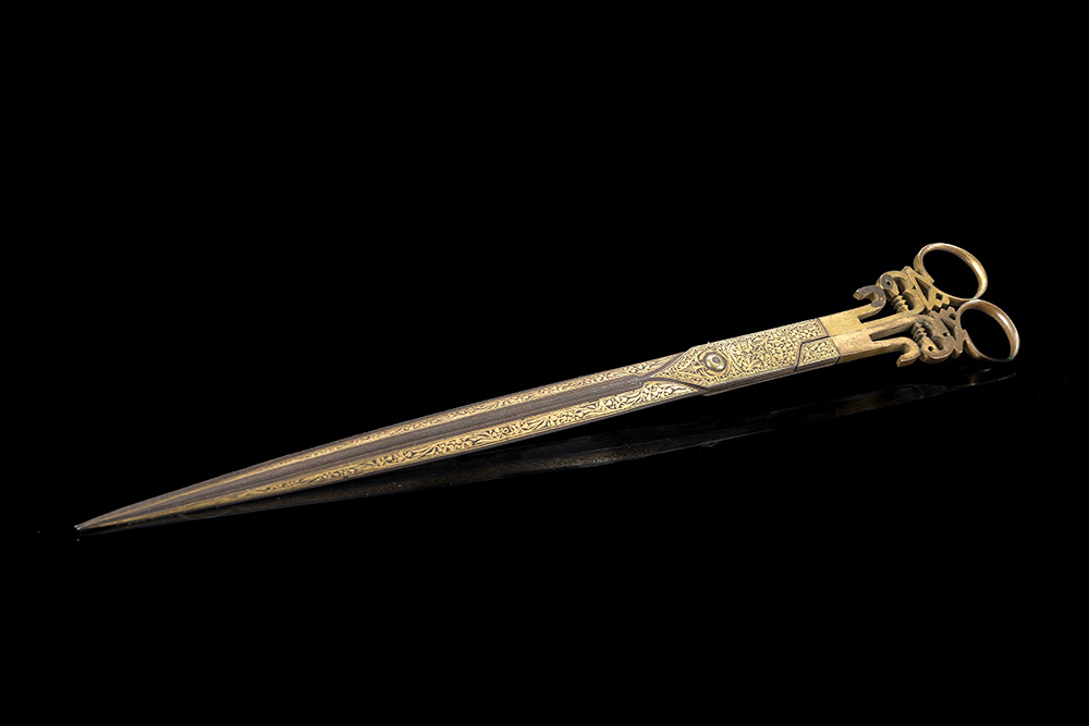 Forbice in ferro ageminato in oro a volute fogliate, presa a lettere stilizzate. Persia, secolo XIX (cm 28)