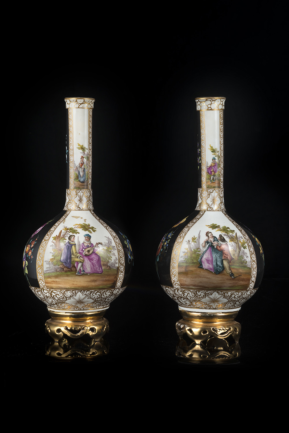 Manifattura del secolo XIX, Augustus Rex. Coppia di vasi a bottiglia in porcellana decorati a riserve su fondo nero, intervallate da motivi stilizzati dorati, contenenti scene galanti e mazzi di fiori (h. cm 31) Su basi in porcellana dorate traforate non pertinenti (difetti)