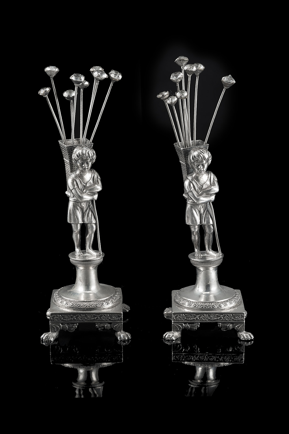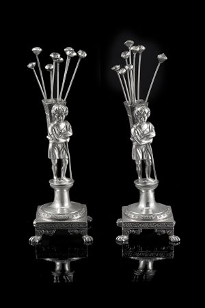 Coppia di porta stuzzicadenti in argento, i sostegni in forma di contadinelli su plinto tornito poggiante su base quadrata, piedi ferini; uniti a diciotto stuzzicadenti. Secolo XIX (g 325 ca.) (difetti)