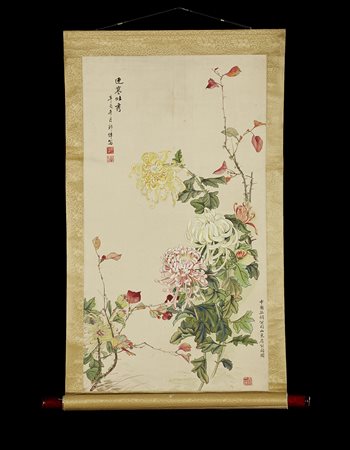 Scroll verticale raffigurante rami di crisantemo in fiore e foglie con iscrizioni calligrafiche e sigilli dell'artista, inchiostro e colore su seta, con montatura in seta