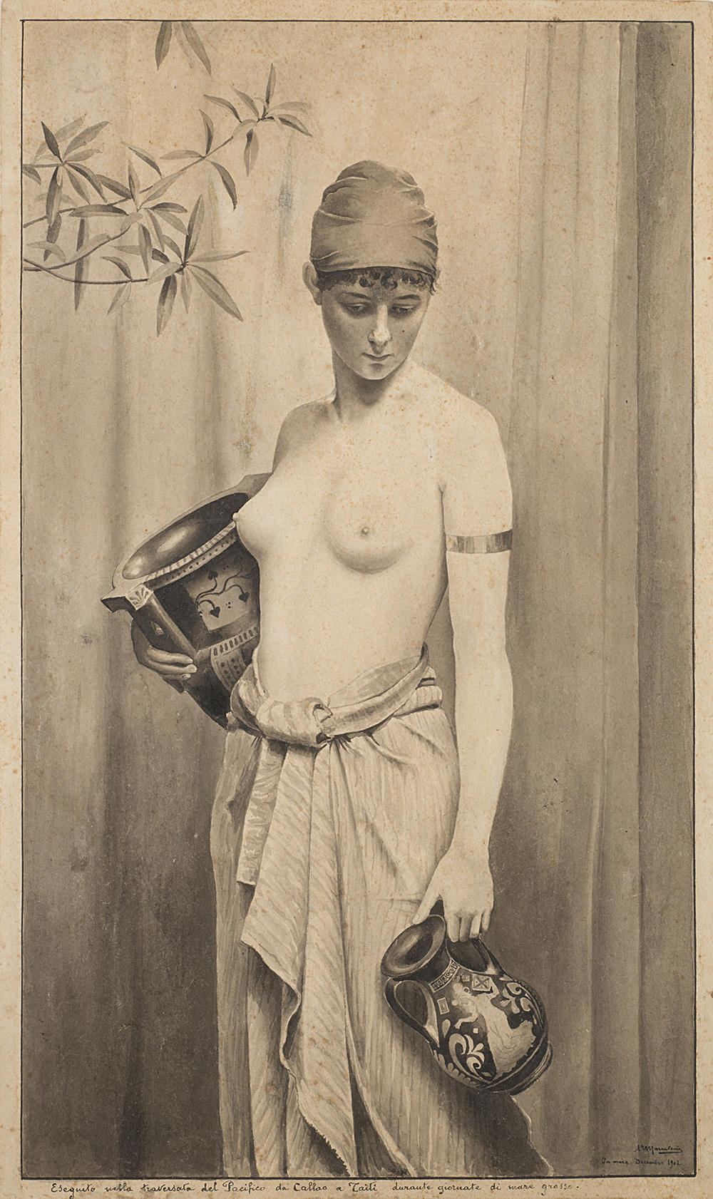Marantonio "Acquaiola" 1902. Acquerello monocromo su carta (cm 38x23) Firmato, datato in basso a destra e inscritto al centro "Eseguito nella traversata del Pacifico da Callao a Tahiti durante giornate di mare grosso" In cornice