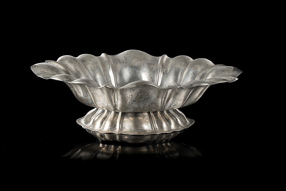 Alzata in argento con bordo mistilineo e corpo costolato. Titolo 800 (cm 40x13x32) (g 1000 ca.)