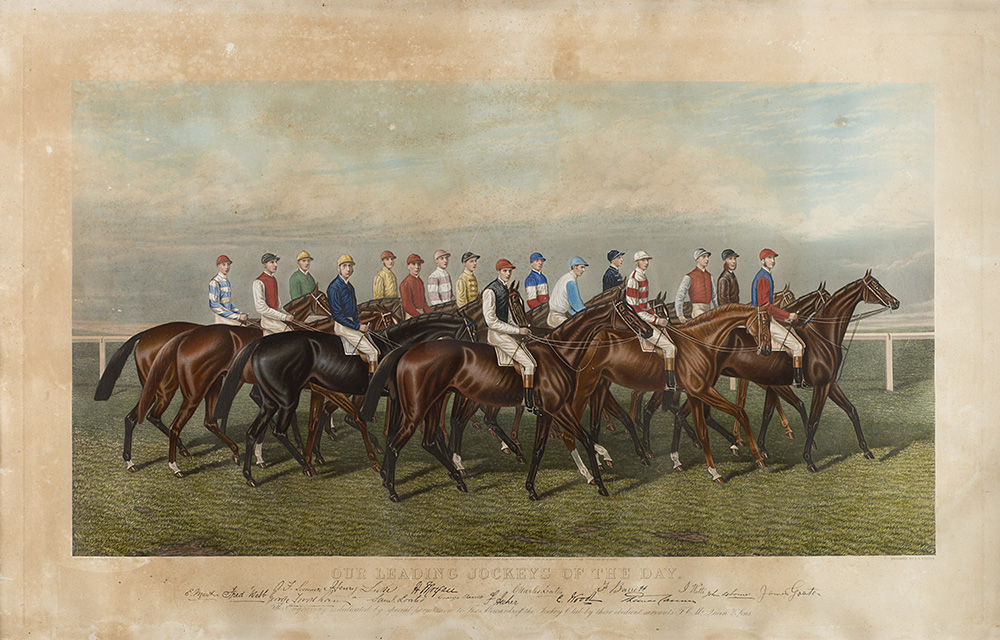 "Our leading jockeys of the day" engraving (cm 68x110) Autographed by the jockeys. Framed (defects)