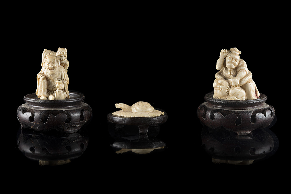 Tre netsuke in avorio raffiguranti animali e personaggi leggendari firmati,...