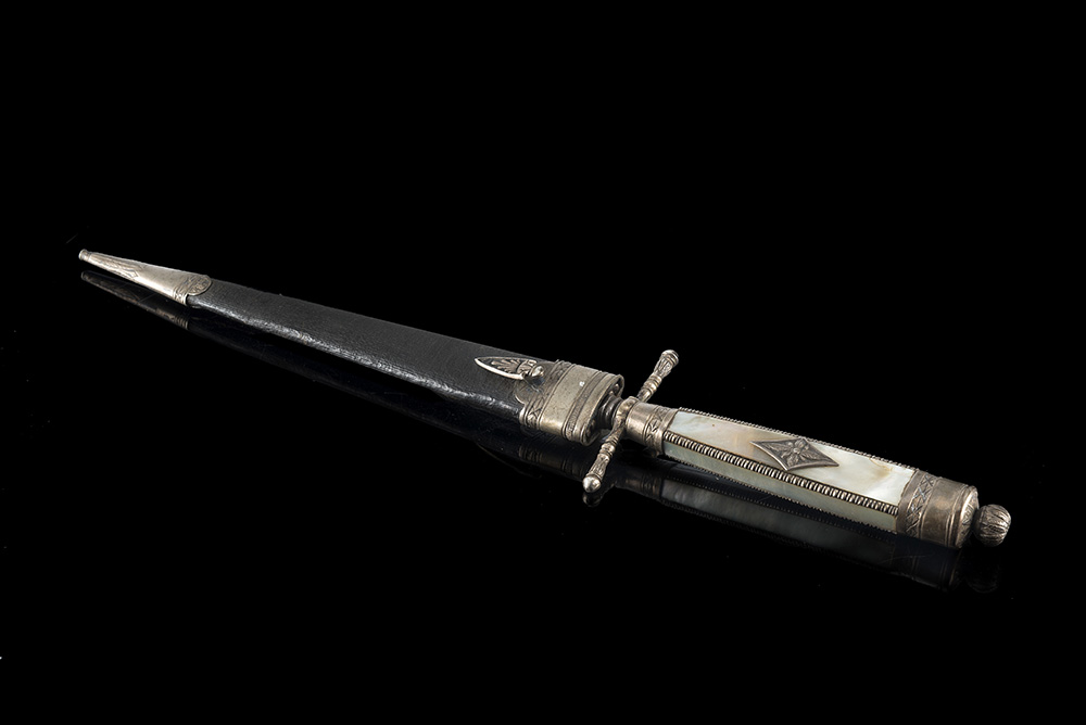 Daghetta con finimenti in bronzo e manico foderato in quattro parti di madreperla. Guardia a rocchetto, lama a doppio taglio a losanga riccamente incisa di giraglie e trofei d'arme. Fodero in pelle con guarniture cesellate in metallo. Primo quarto del secolo XIX (cm 31,5) (difetti)