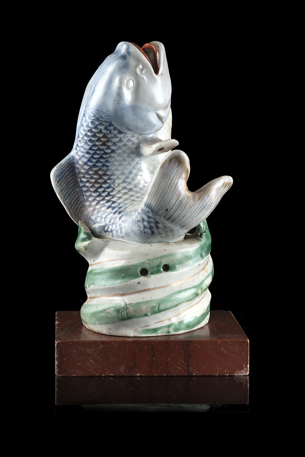 Carpa in porcellana smaltata, base in marmoGiappone, secolo XX(h. cm...