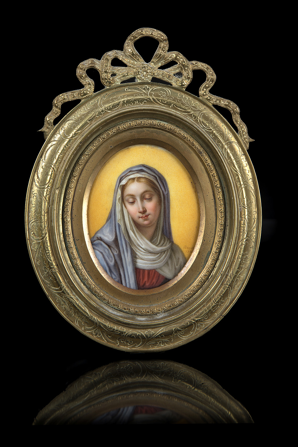 "La Vergine" Firmata e datata a destra 1840. Miniatura ovale su porcellana (cm 7x6) In cornice in bronzo dorato inciso a motivi vegetali con cimasa a fiocco