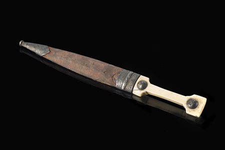 Piccolo pugnale caucasico con lama a losanga ponzonata e piccola impugnatura in avorio con bottoni di codolo decorati. Fodero ricoperto di tessuto rosso con parti di metallo argentato cesellati a motivi geometrici. Inizi secolo XIX (cm 20,5) (difetti)