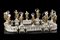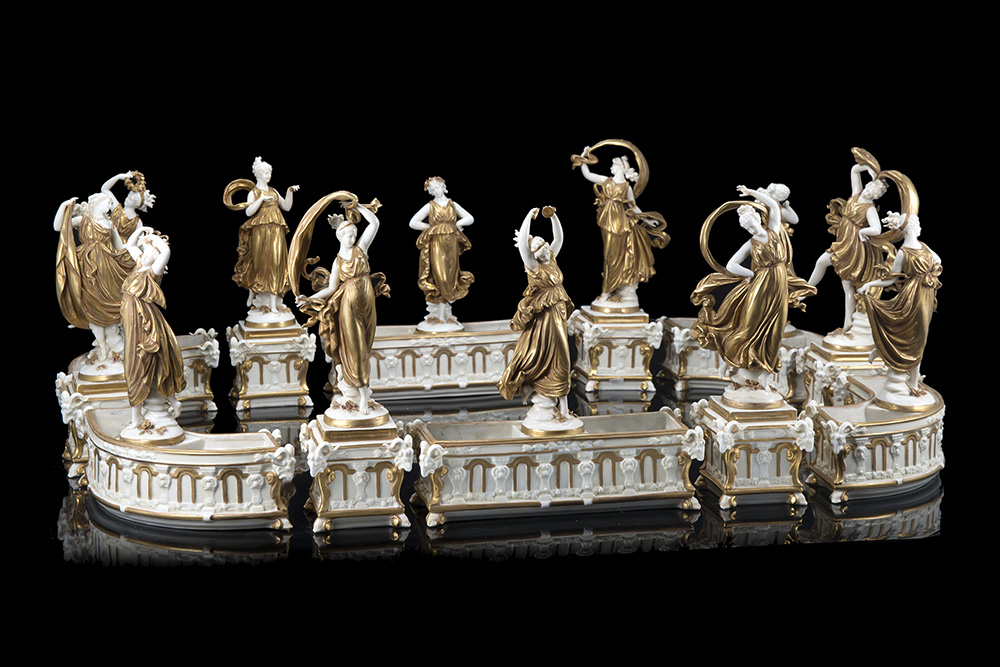 Manifattura di Capodimonte, seconda metà secolo XIX. Centrotavola in porcellana bianca e oro composto da dodici figure femminili danzanti poggianti su plinti e vaschette portafiori decorati da teste di ariete e piedi caprini (difetti)