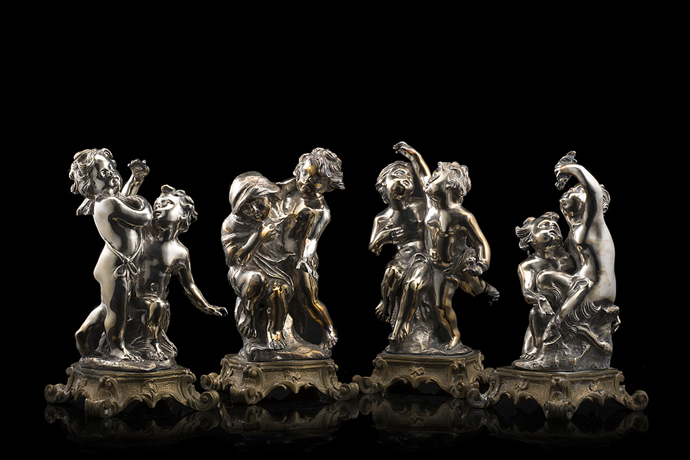 "Allegory of the four seasons" group of four silvered bronze sculptures. Signed E. Avolio (h. cm 20) On bronze base (minor defects)