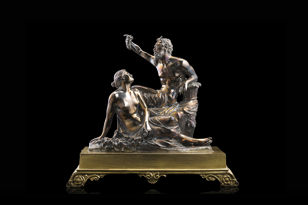 "Fauno baccante con ninfa" scultura in bronzo argentato. Firmata E. Avolio e datata 1912 al retro (h. cm 30) Poggiante su base in stile Impero in bronzo (lievi difetti)