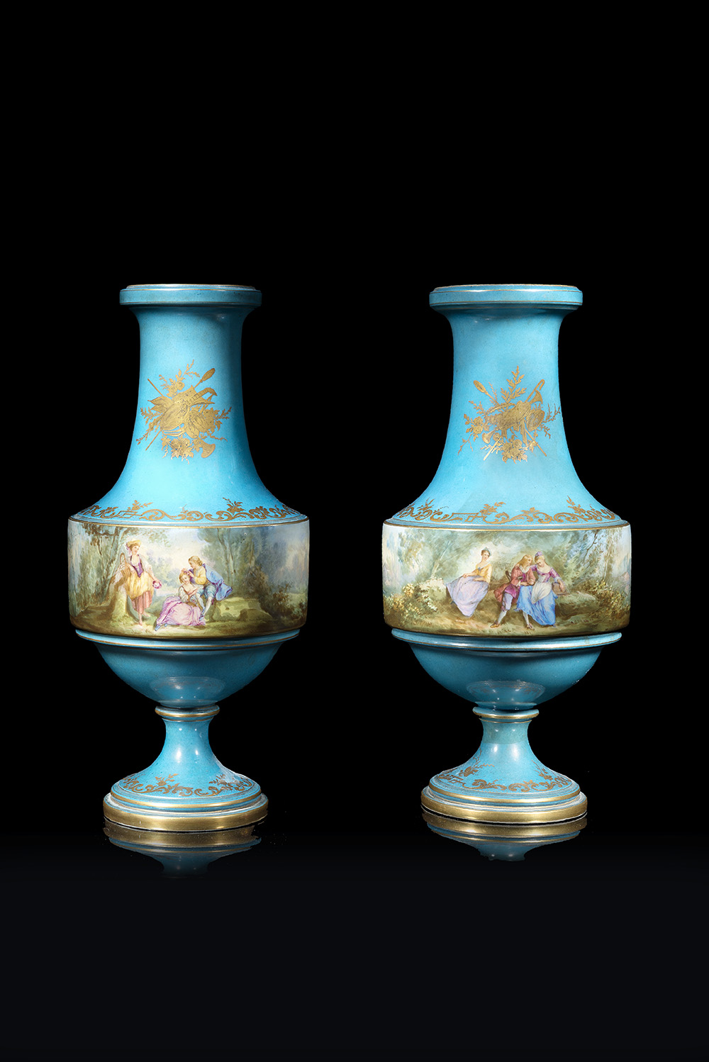 Manifattura di Sèvres, fine del secolo XIX. Coppia di vasi a balaustro in porcellana a fondo blu decorati in policromia con scene galanti, fiori e motivi stilizzati dorati. Il collo centrato da trofei musicali (h. cm 41) (difetti)