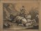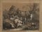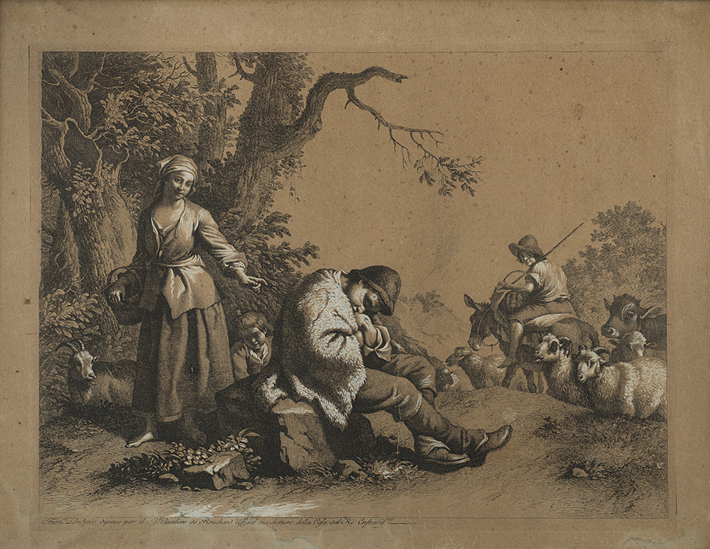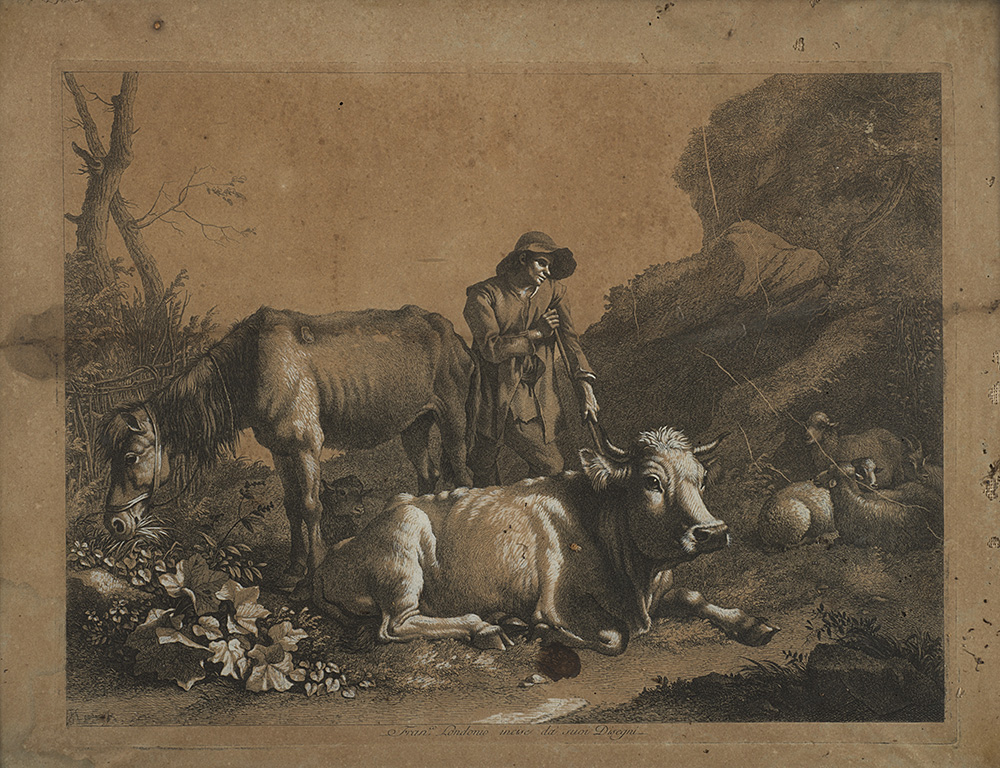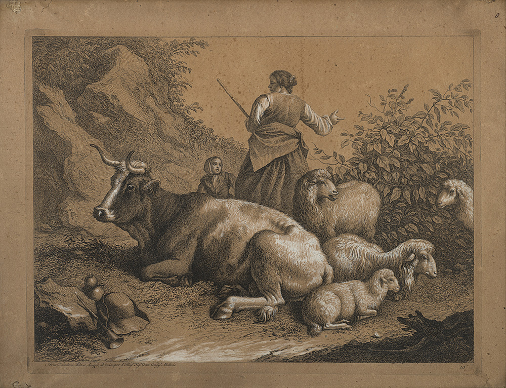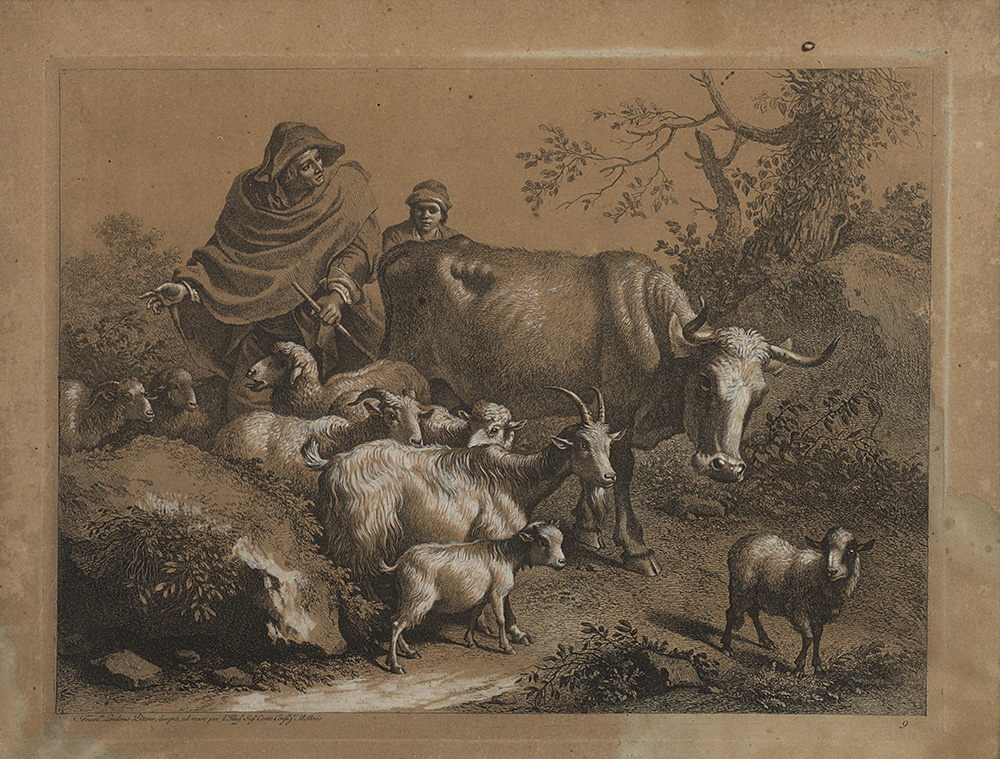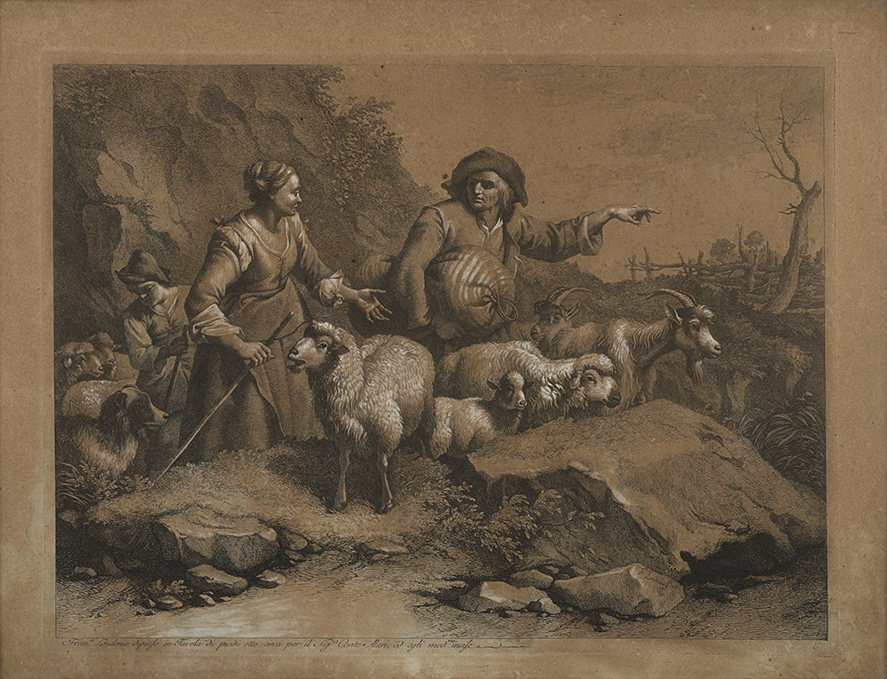 Gruppo di sei incisioni intelate con interventi in biacca raffiguranti paesaggi con contadini e armenti (mm 320x420) In cornici lastronate in noce (difetti)