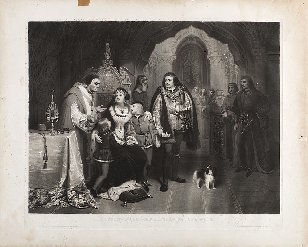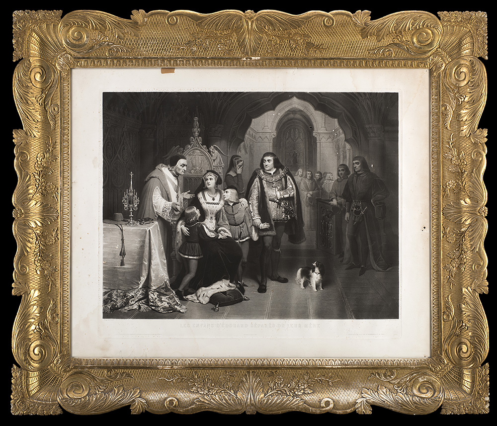 A 19th-century Neapolitan giltwood frame (cm 84x103) Containing an engraving after Gosse titled "Les enfants d'Edouard séparés de leur mère" (defects)