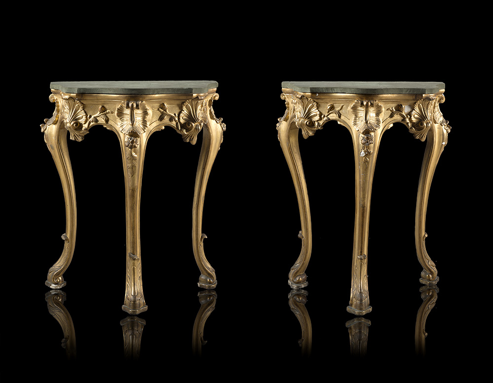Coppia di piccole consolles in legno intagliato e dorato a volute fogliate e fiori. Gambe mosse terminanti con piedi a ricciolo. Piano in legno rivestito in velluto (cm 72x90x42) Secolo XIX (difetti)