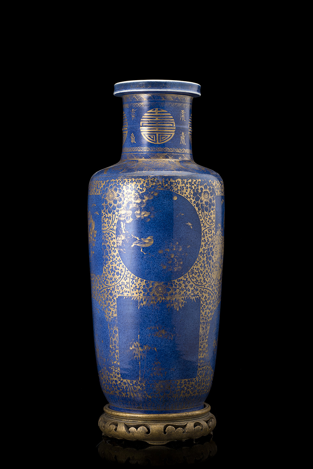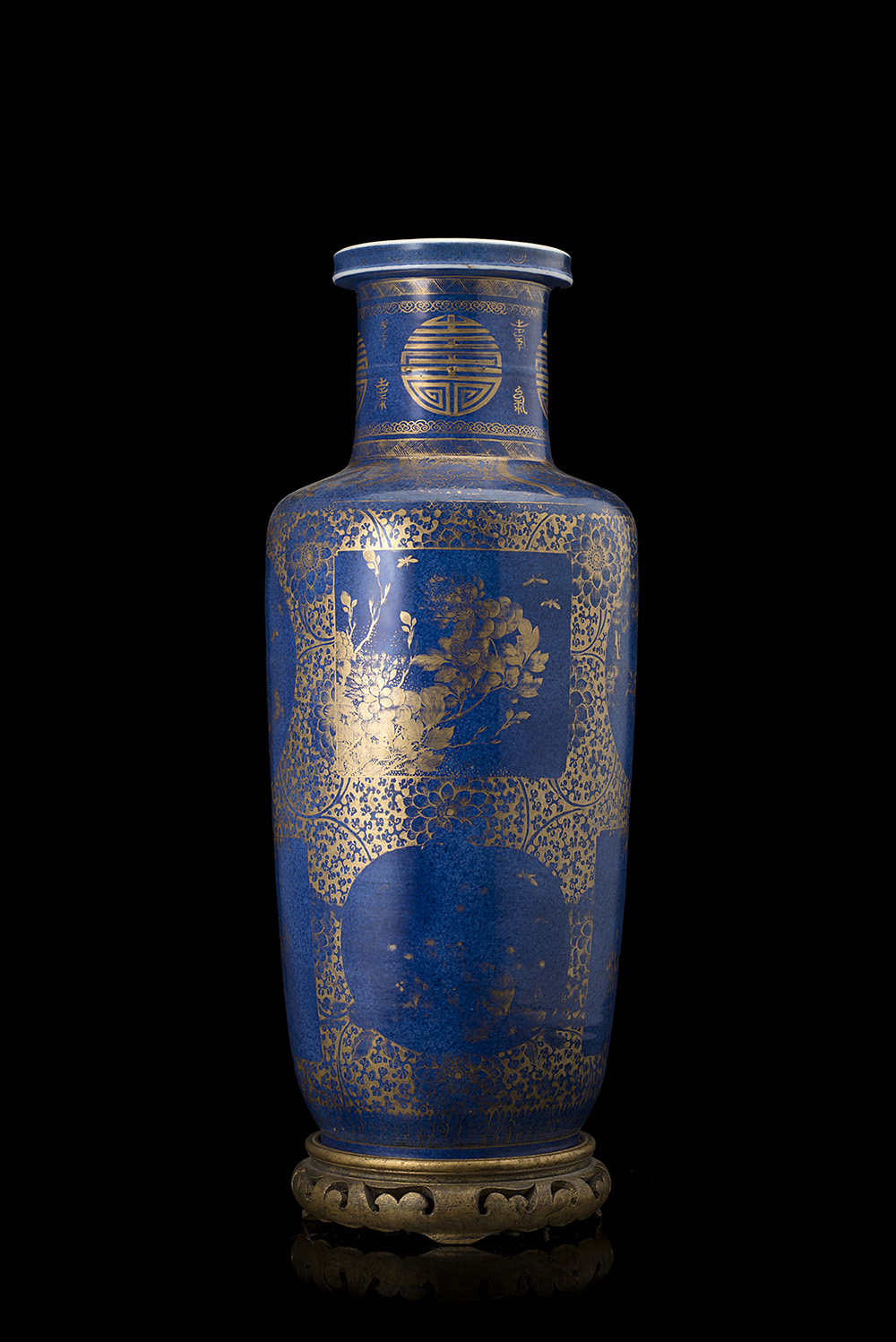 Vaso in porcellana a invetriatura blu, base in legnoCina, secolo XVIII (h. cm...